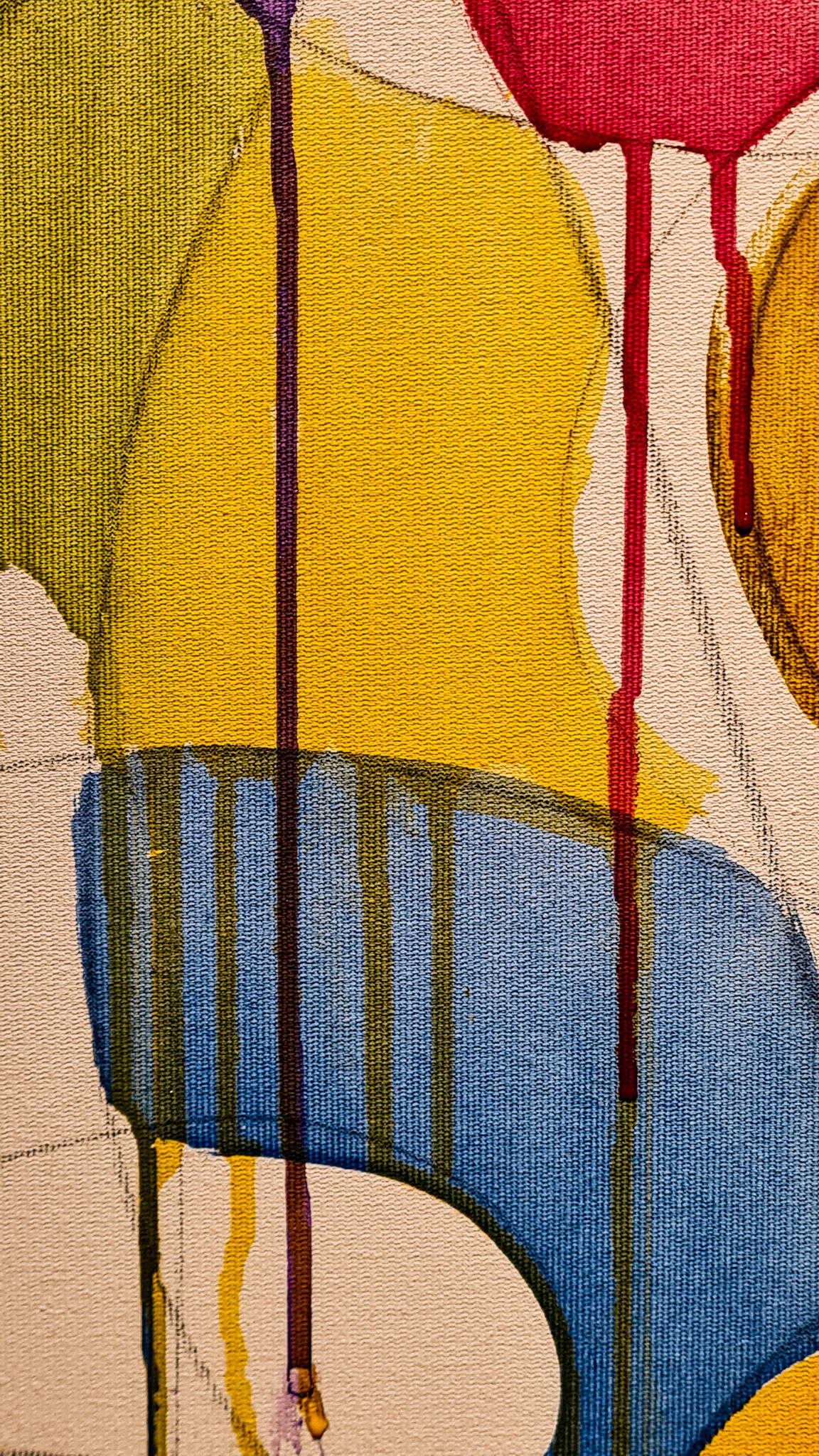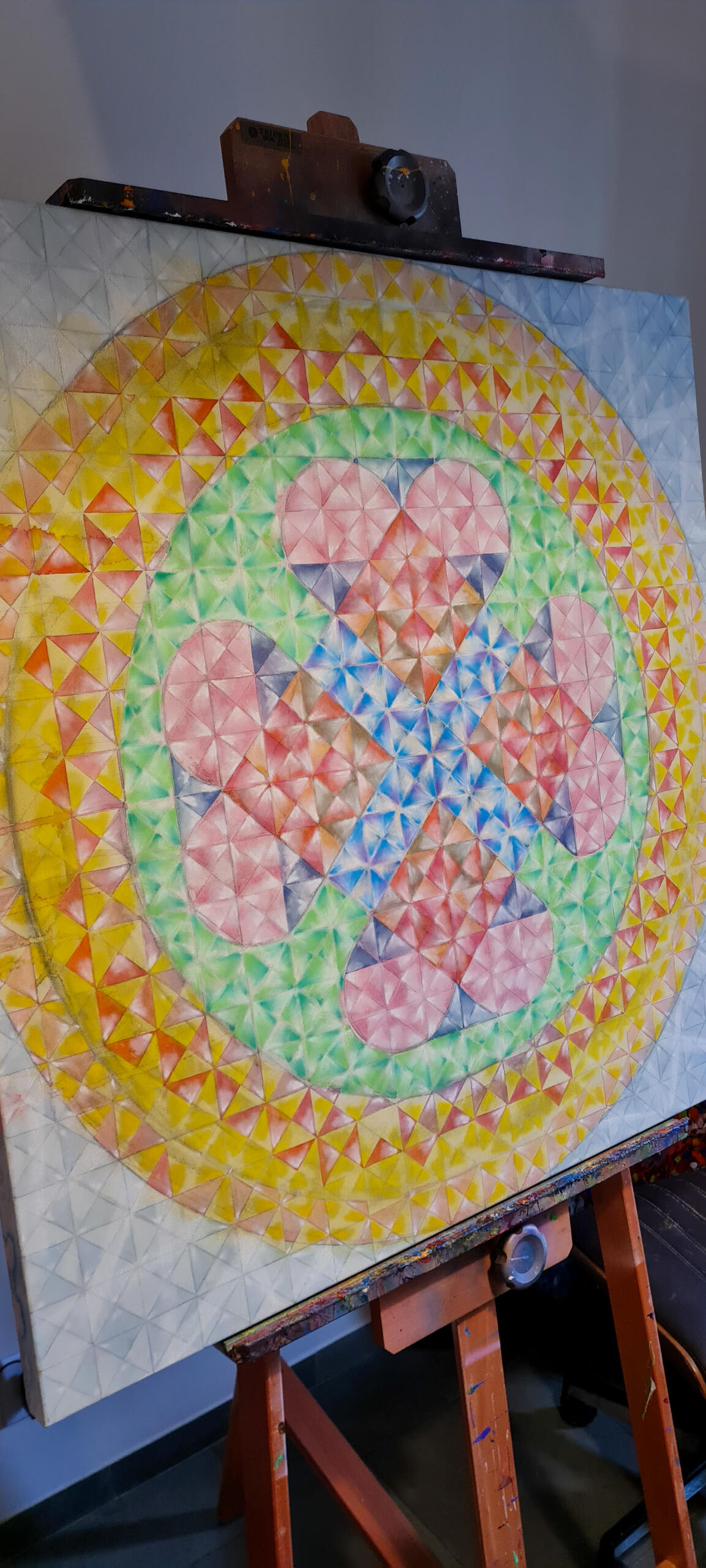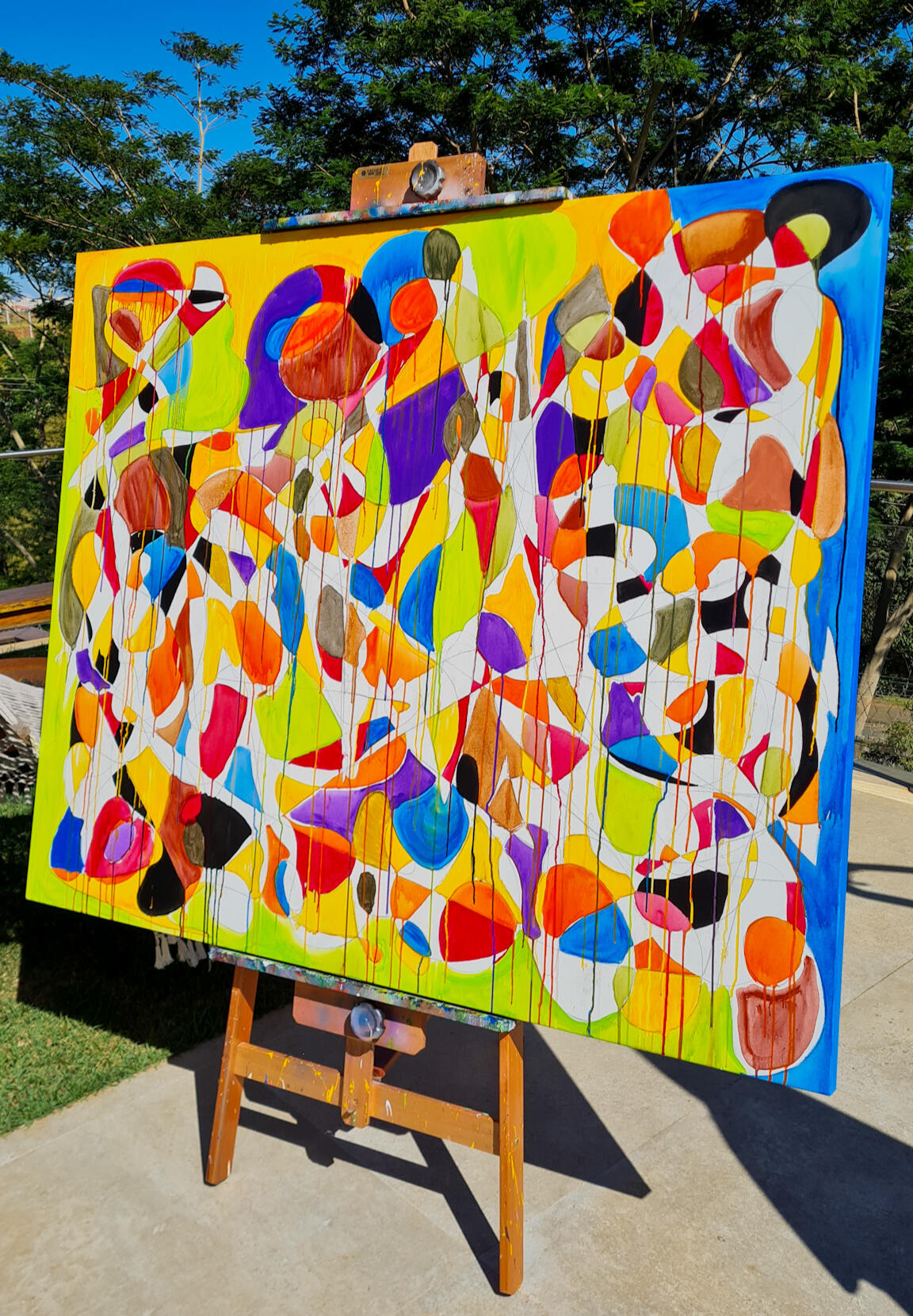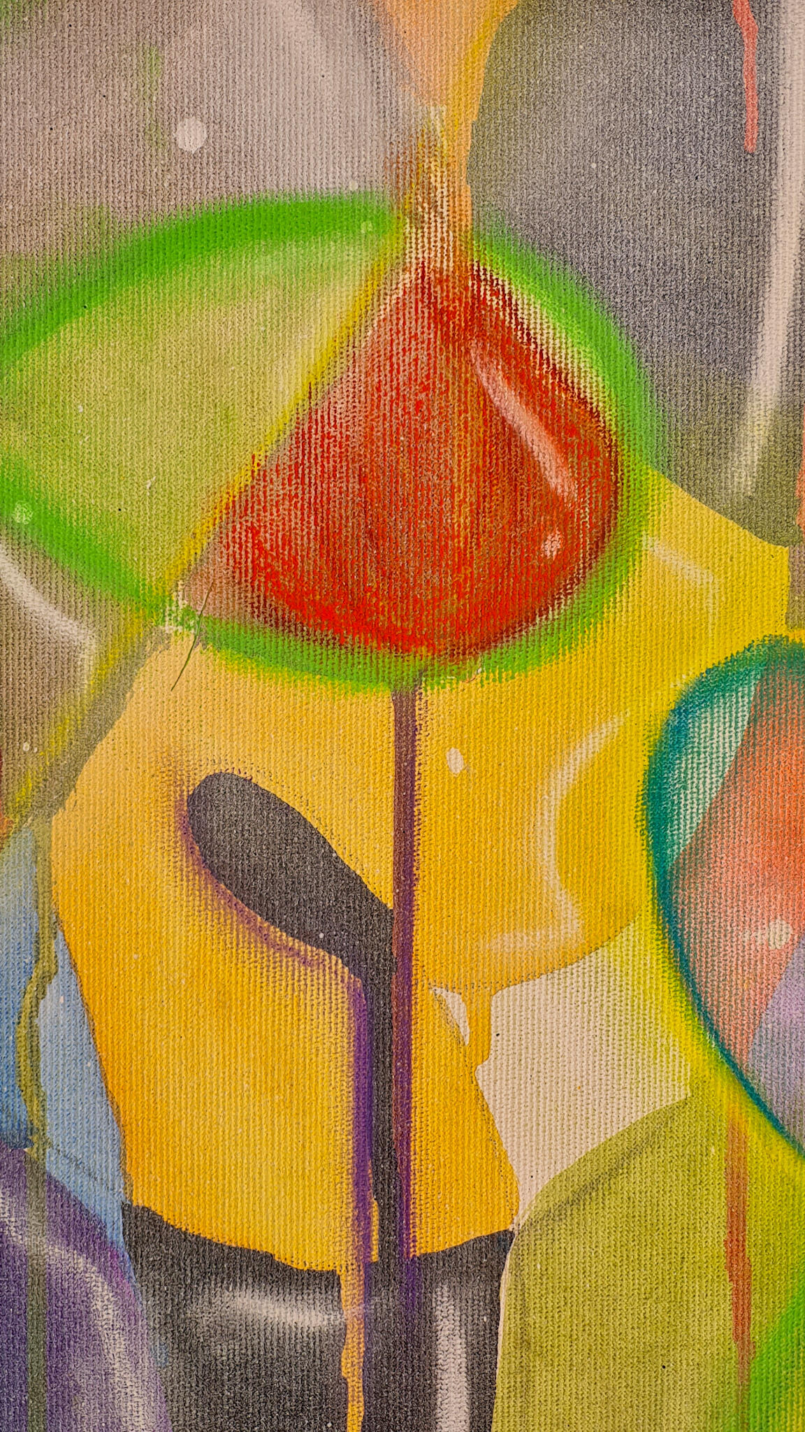 Tela principal em acrílica, giz pastel e grafite sobre tela de algodão, 1,70x1,40m em chassi de madeira com 4cm de profundidade. Acabamento em verniz brilho.