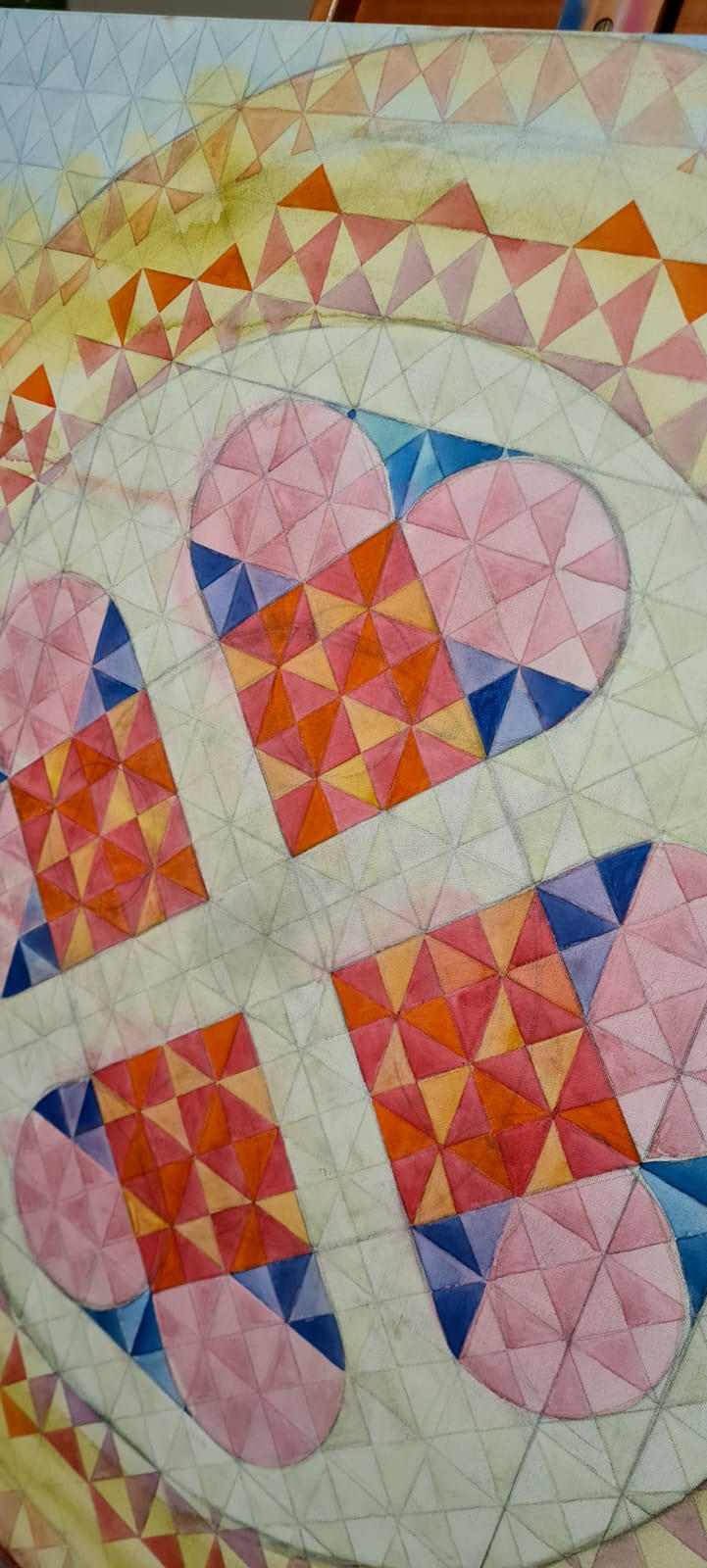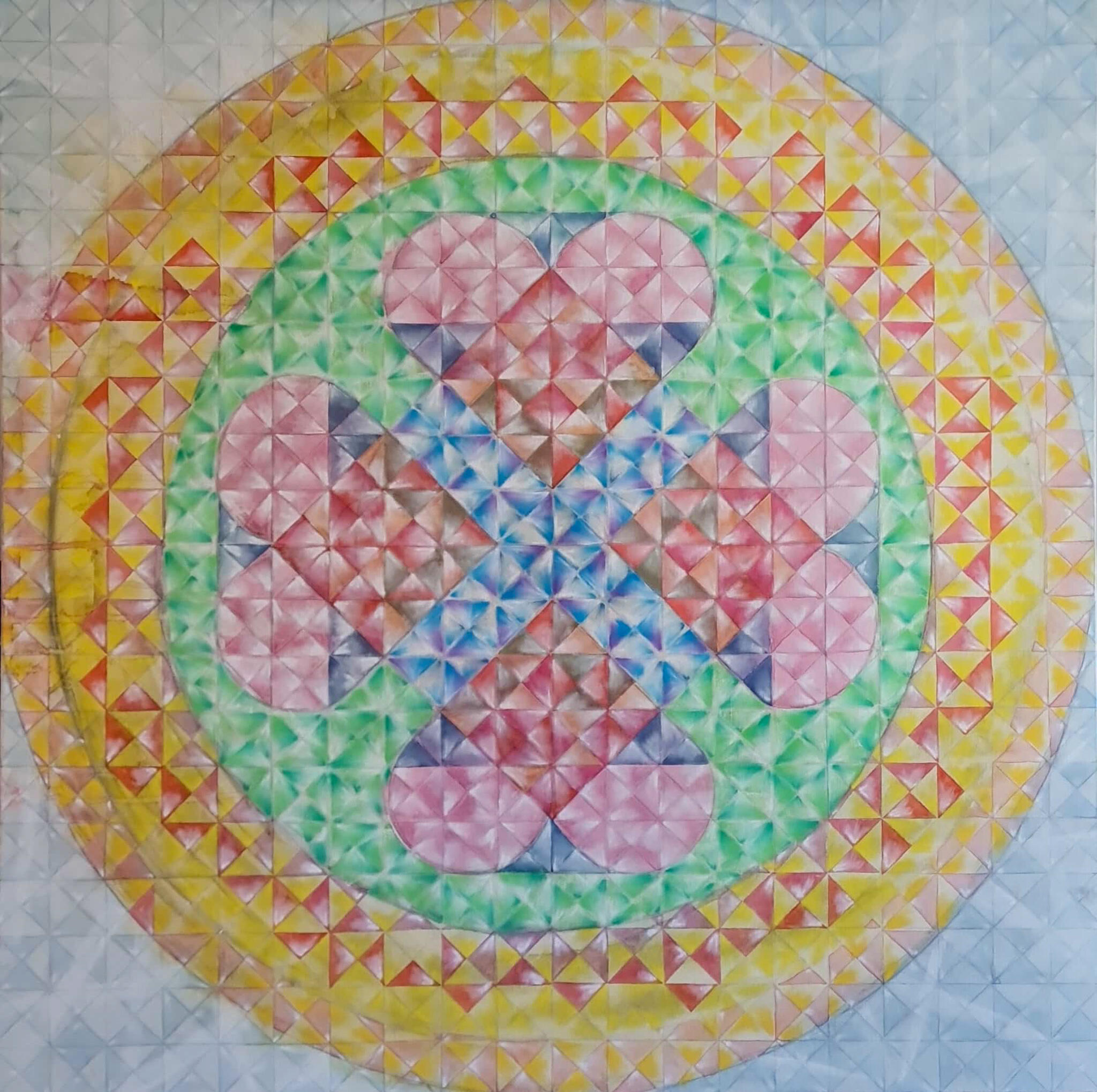 Aquarela sobre tela de algodão, 1x1m em chassi de madeira com 4cm de profundidade. Acabamento em verniz brilho.