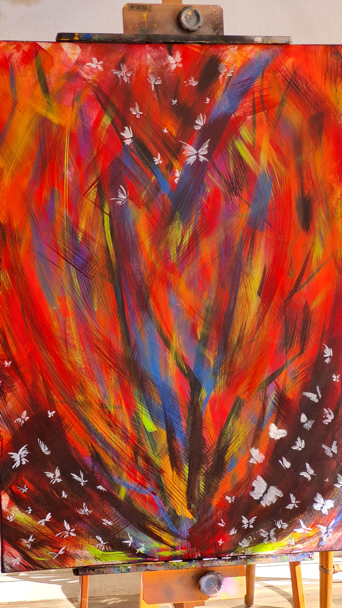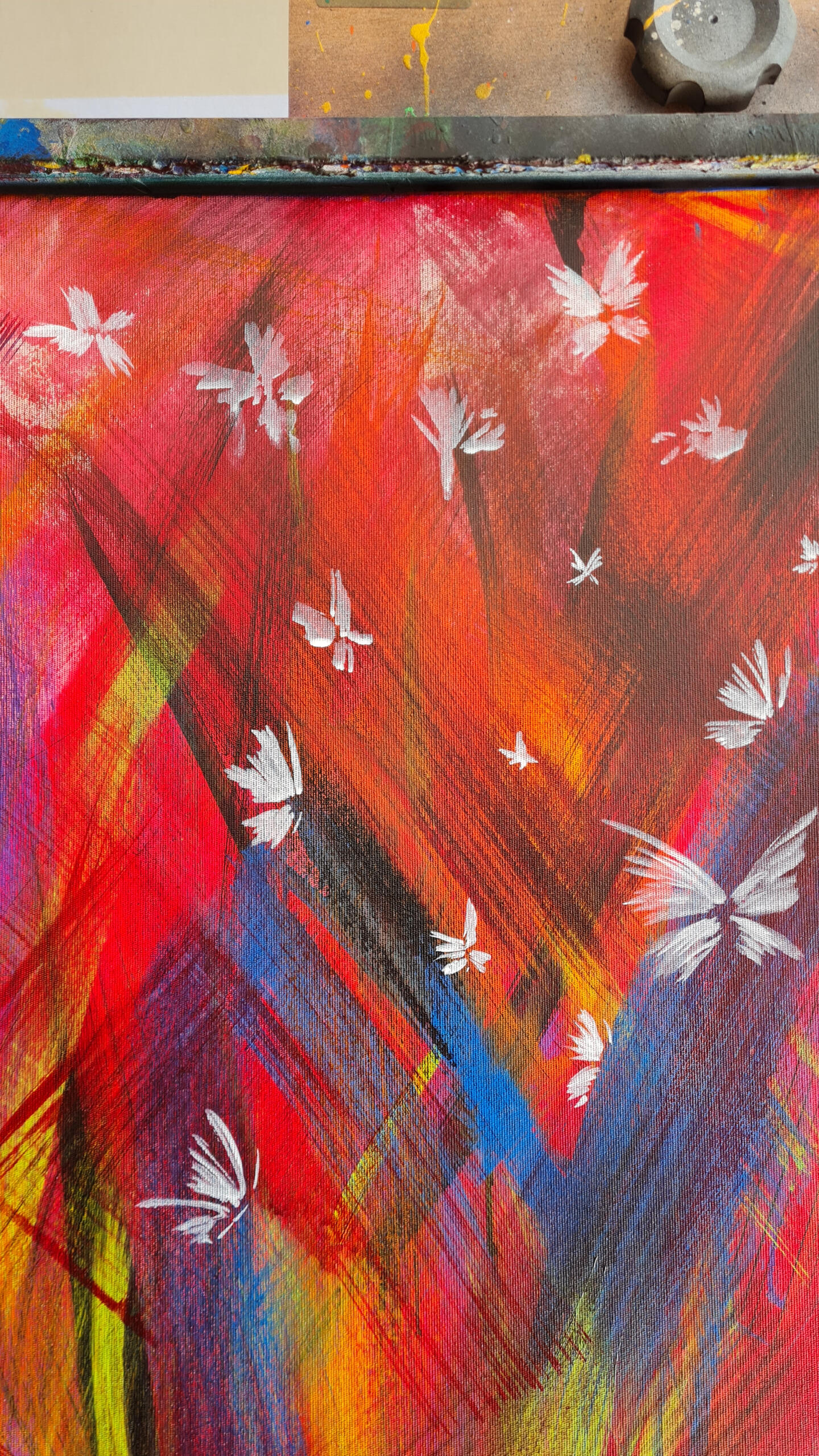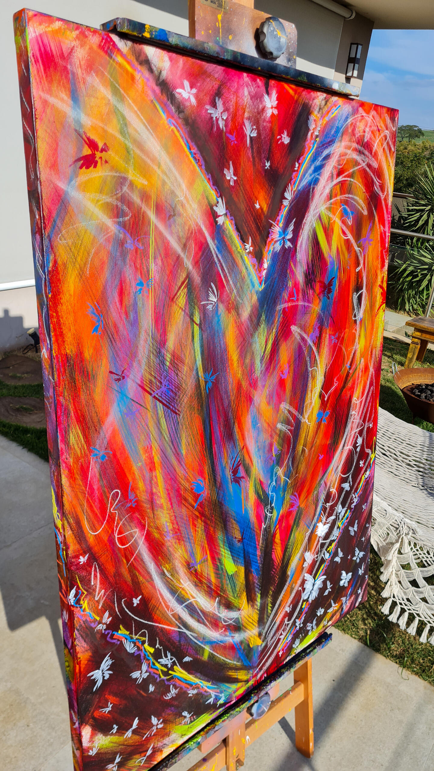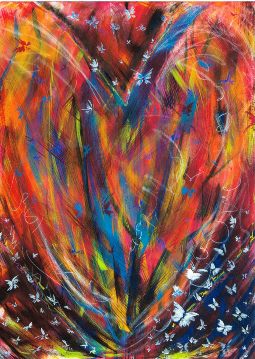 Eu nunca imaginei pintar um coração para expressar o amor. Muito óbvio e clichê. Decidi então que em primeira camada aplicaria as cores que diversas pessoas me apontaram como representativas do amor. Quando olhei para a tela, o coração estava lá. As pinceladas então aconteceram literalmente ritmadas pelo tempo da batida do coração e ao final, as borboletas que representam o frio na barriga daqueles que amam com a força de querer entregar sem medo o seu amor ao outro.