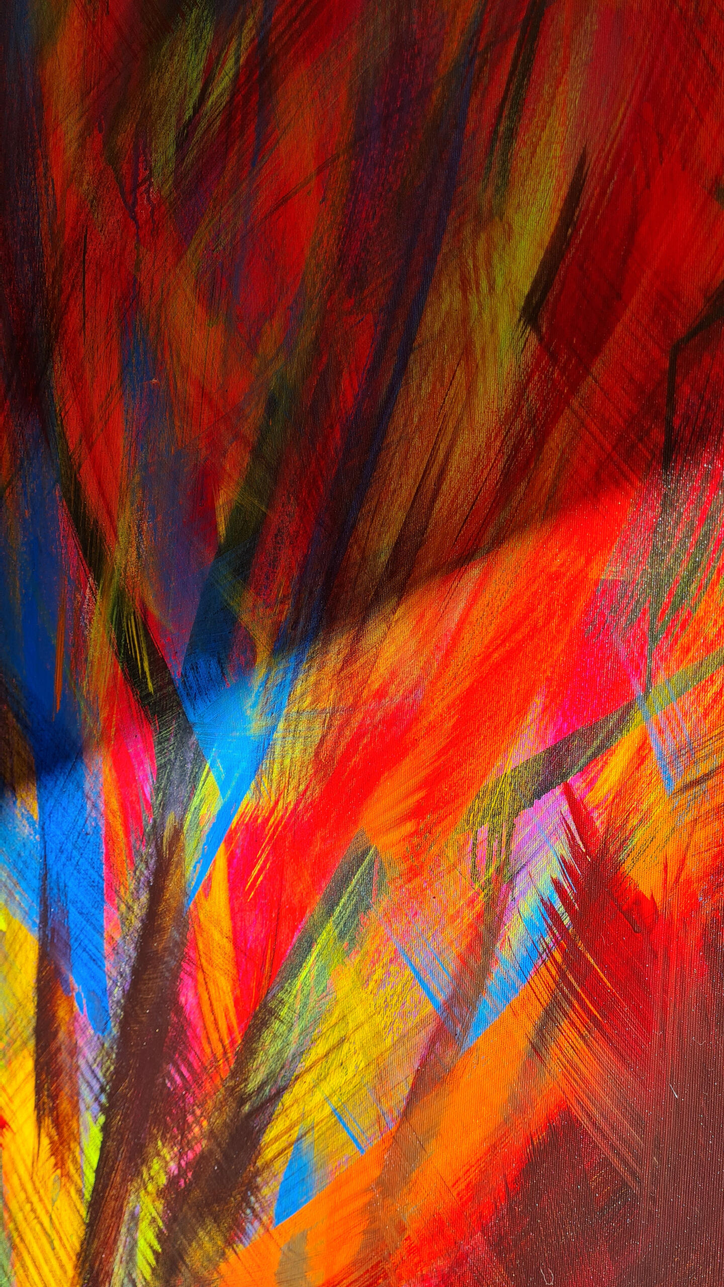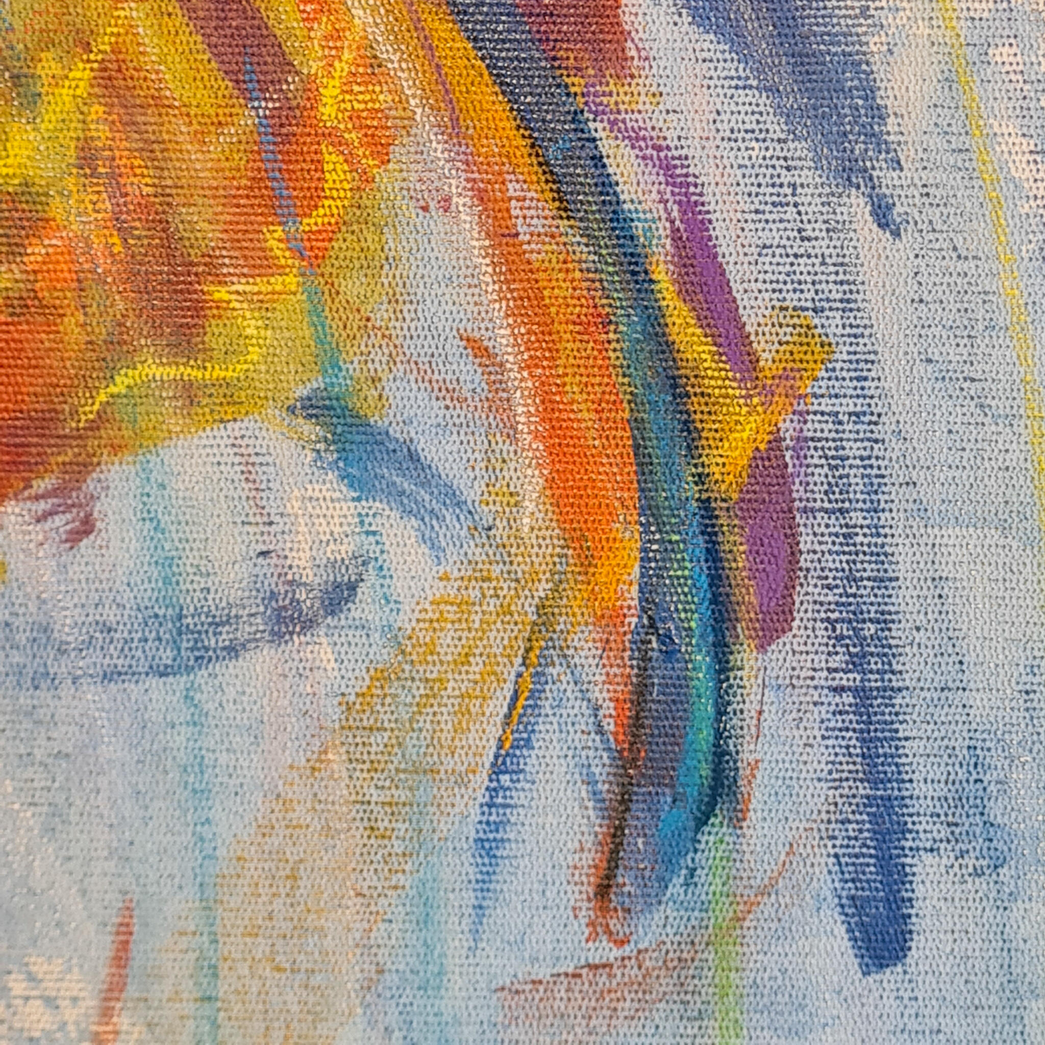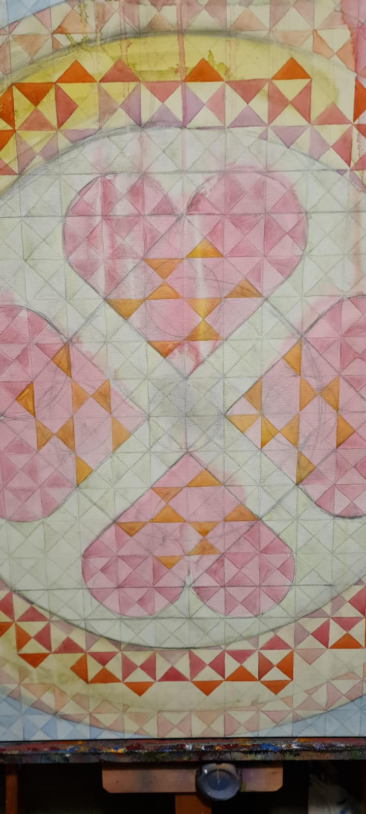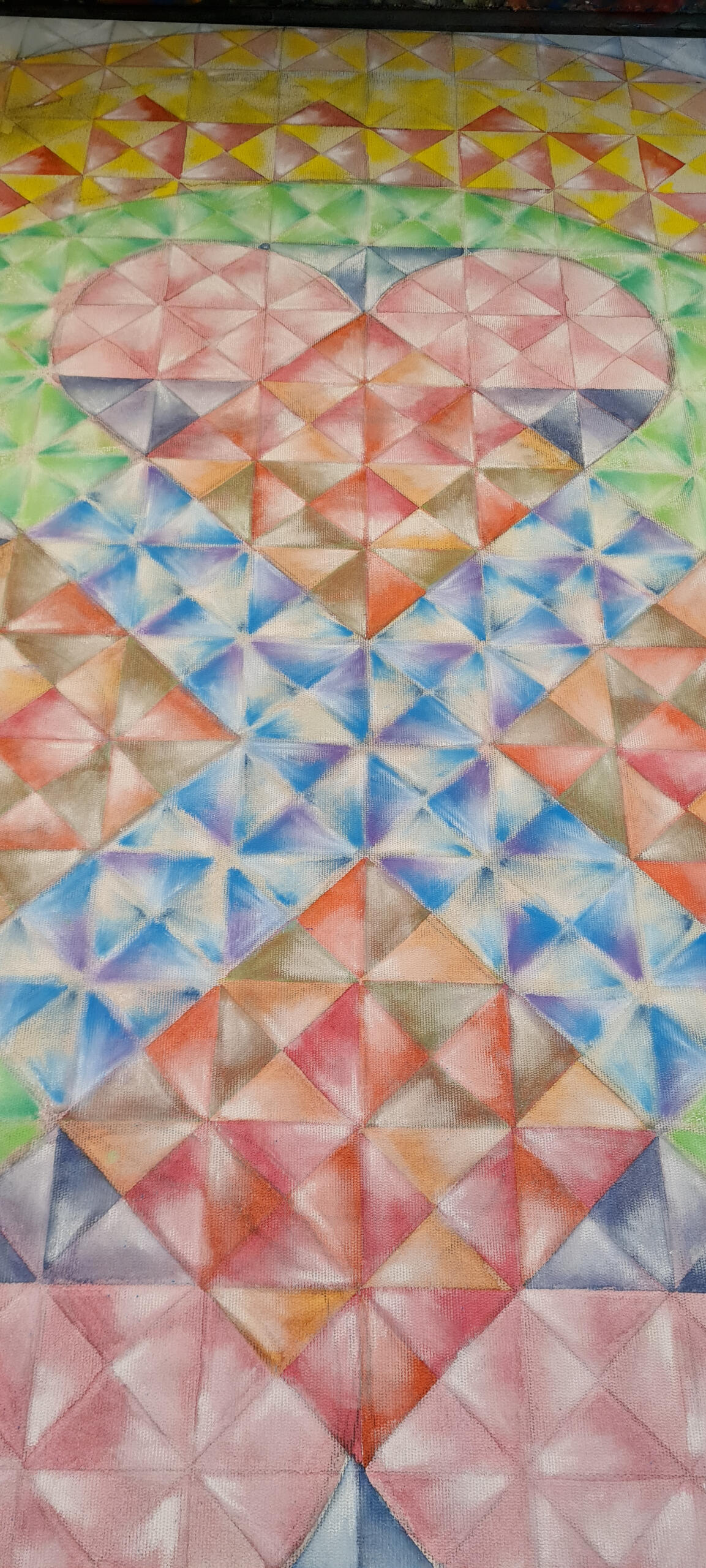 Eu nunca imaginei pintar um coração para expressar o amor. Muito óbvio e clichê. Decidi então que em primeira camada aplicaria as cores que diversas pessoas me apontaram como representativas do amor. Quando olhei para a tela, o coração estava lá. As pinceladas então aconteceram literalmente ritmadas pelo tempo da batida do coração e ao final, as borboletas que representam o frio na barriga daqueles que amam com a força de querer entregar sem medo o seu amor ao outro.