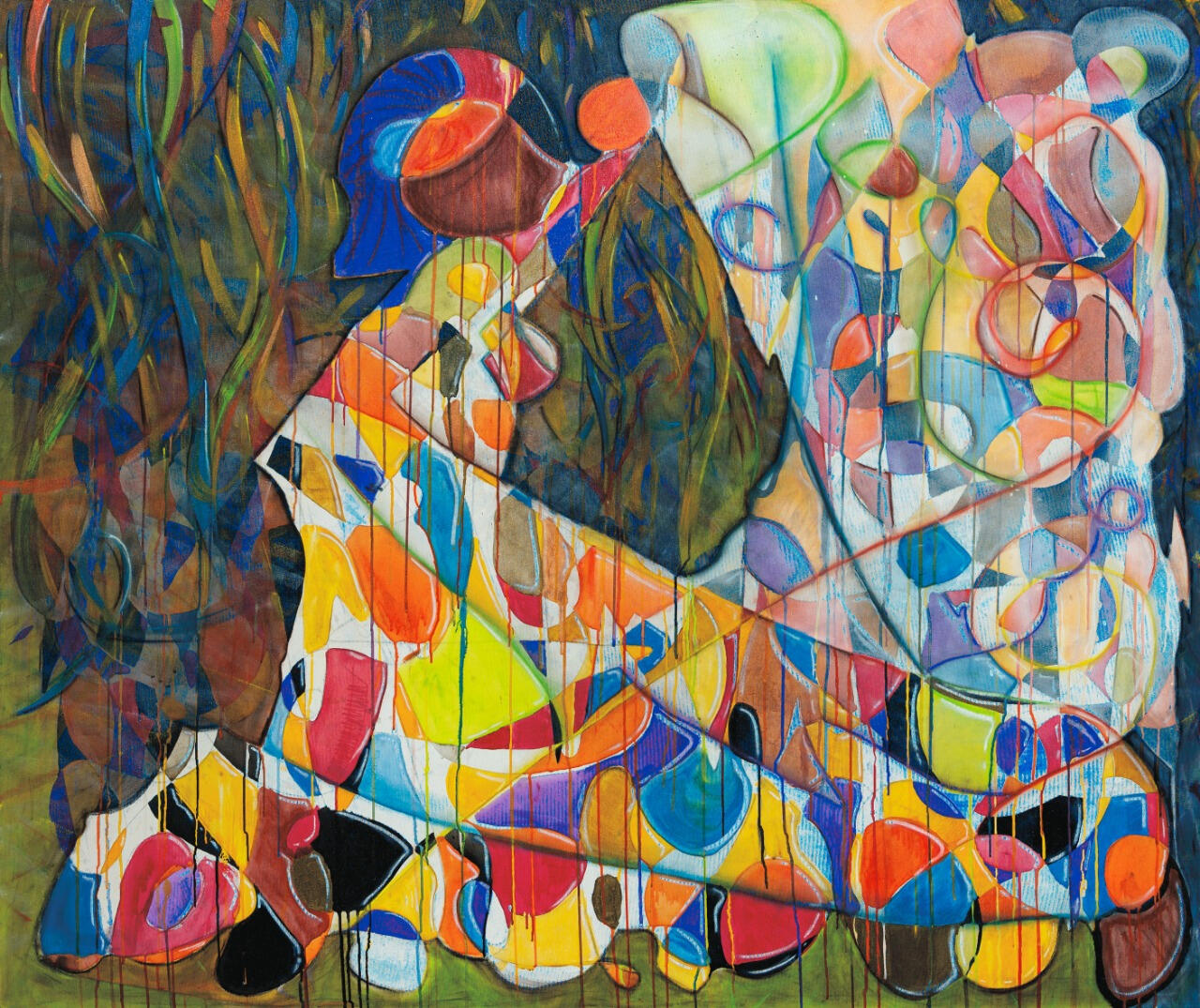 Acrílica, giz pastel e grafite sobre tela de algodão, 1,40x1m em chassi de madeira com 4cm de profundidade. Acabamento em verniz brilho.