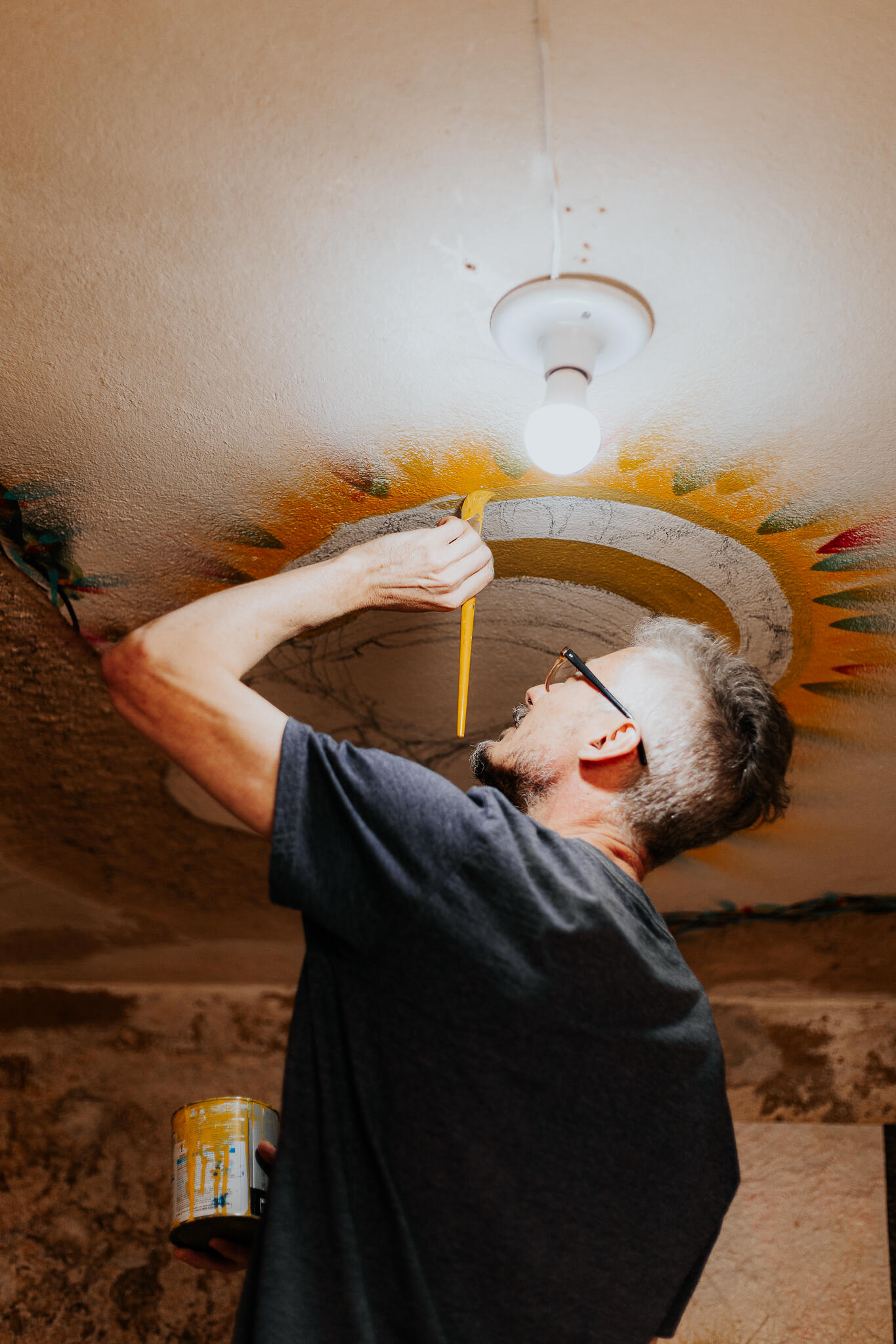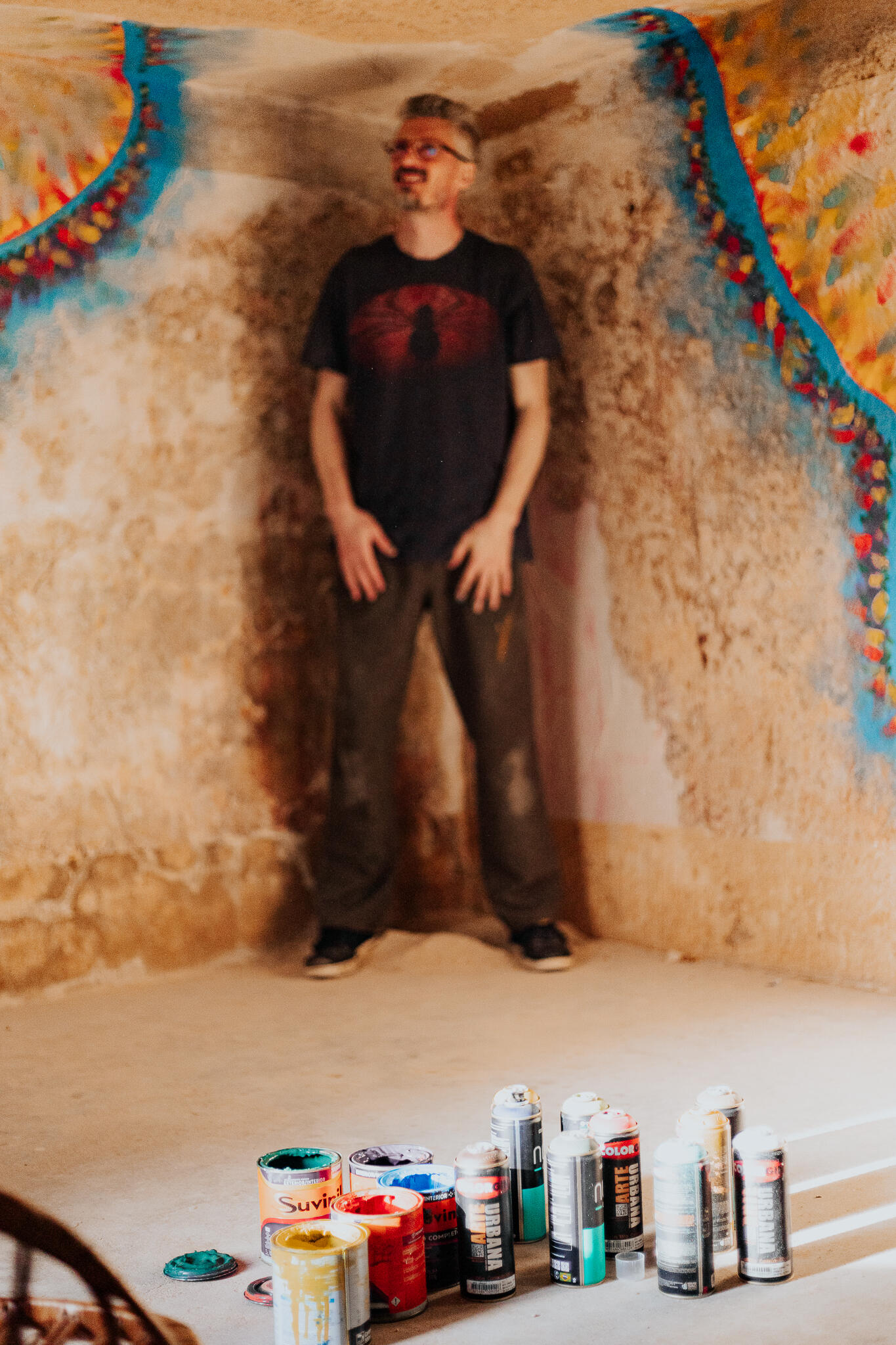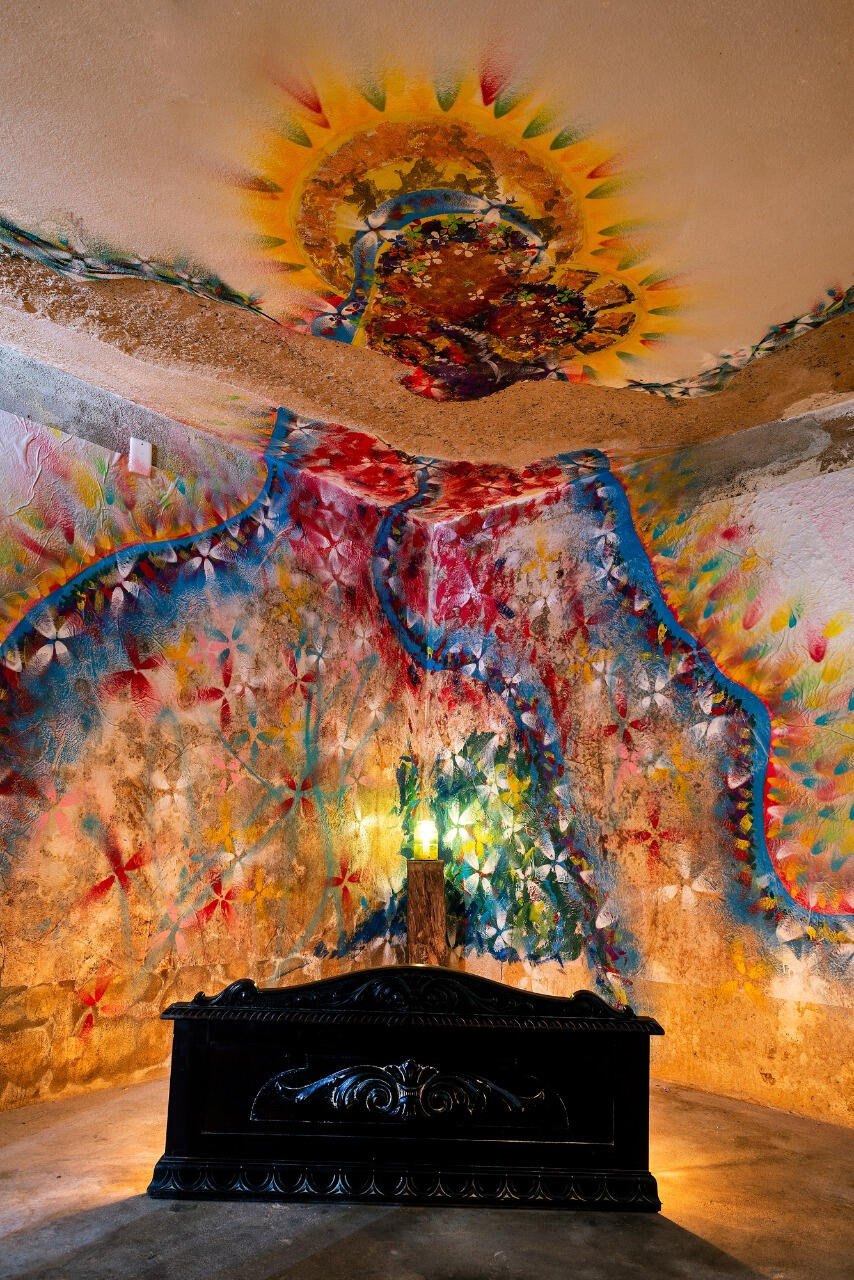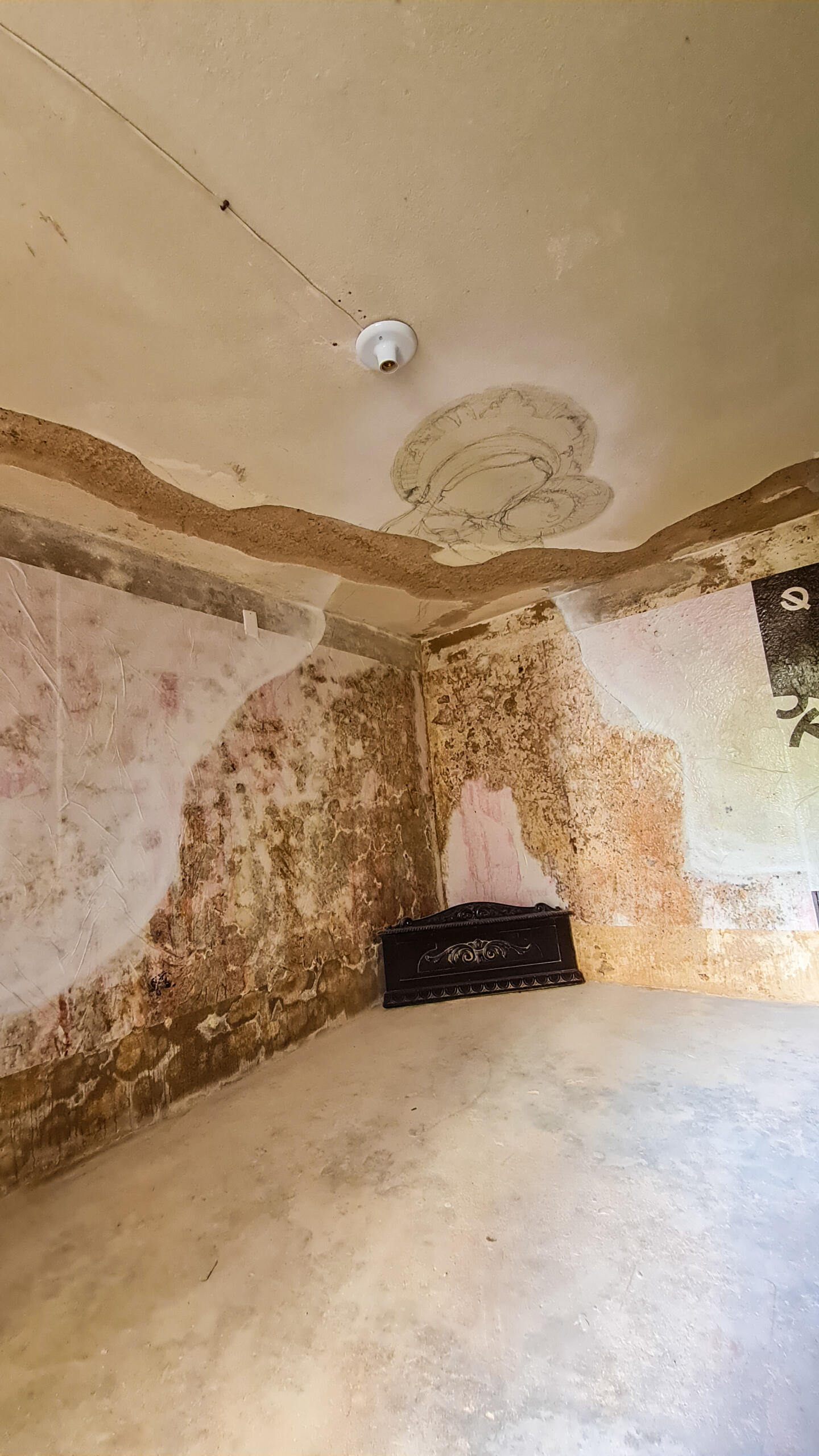 Obra original pintada na quina das paredes com o teto do porão da galeria de arte Lisa França. Pé direito do porão de aproximadamente 2,20m.