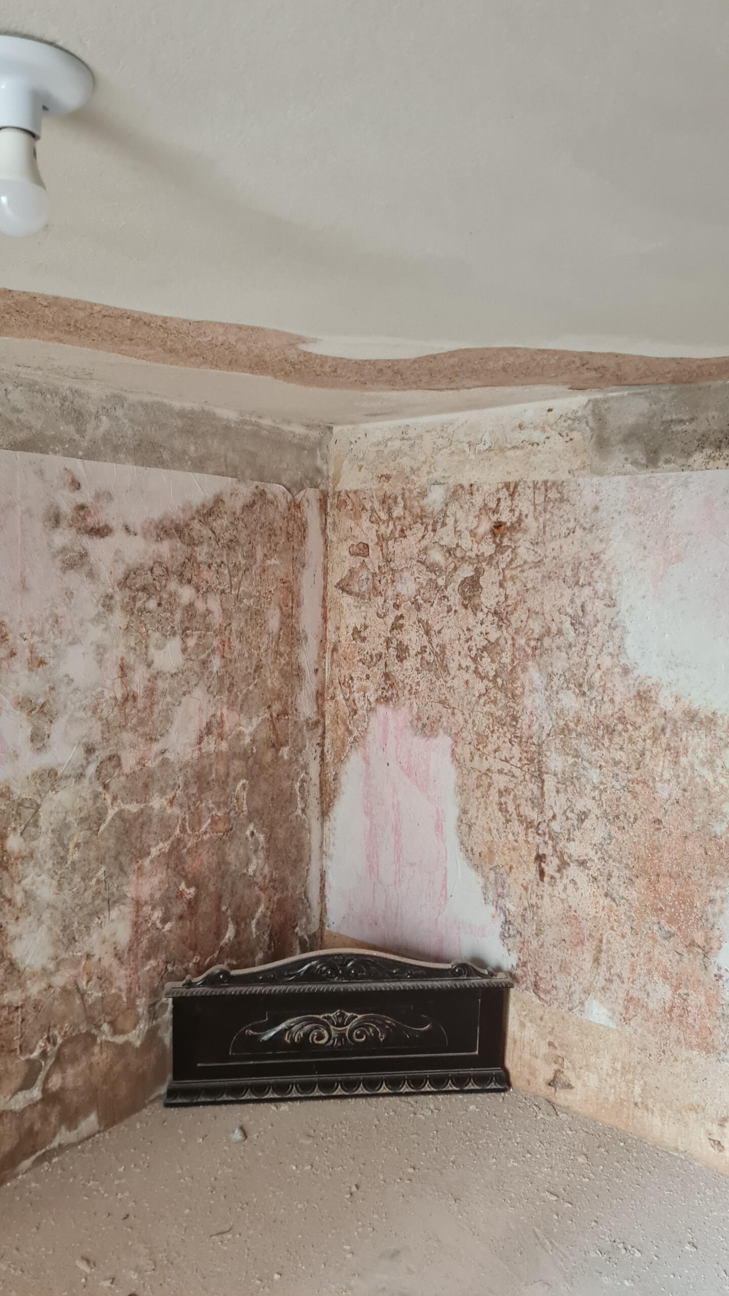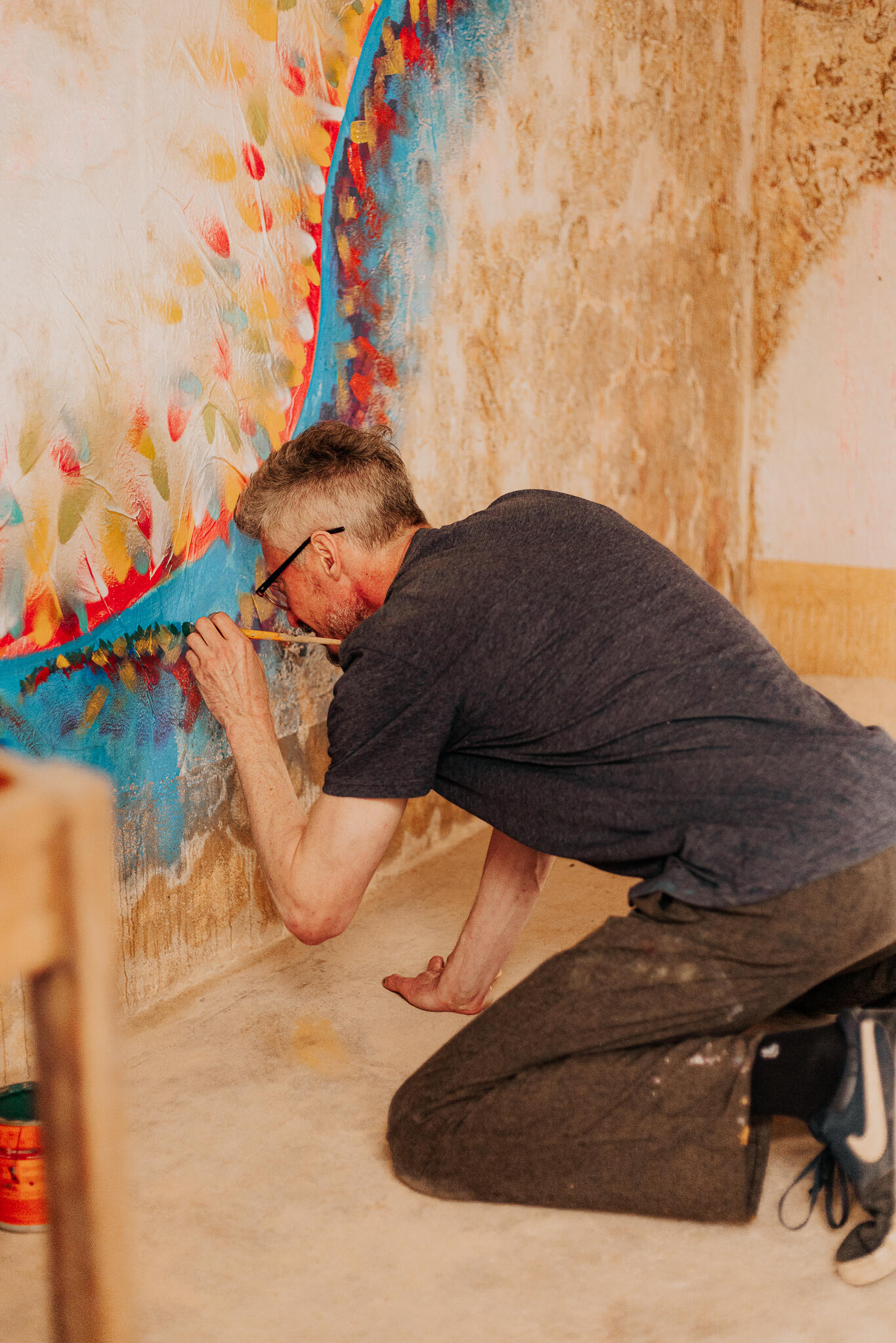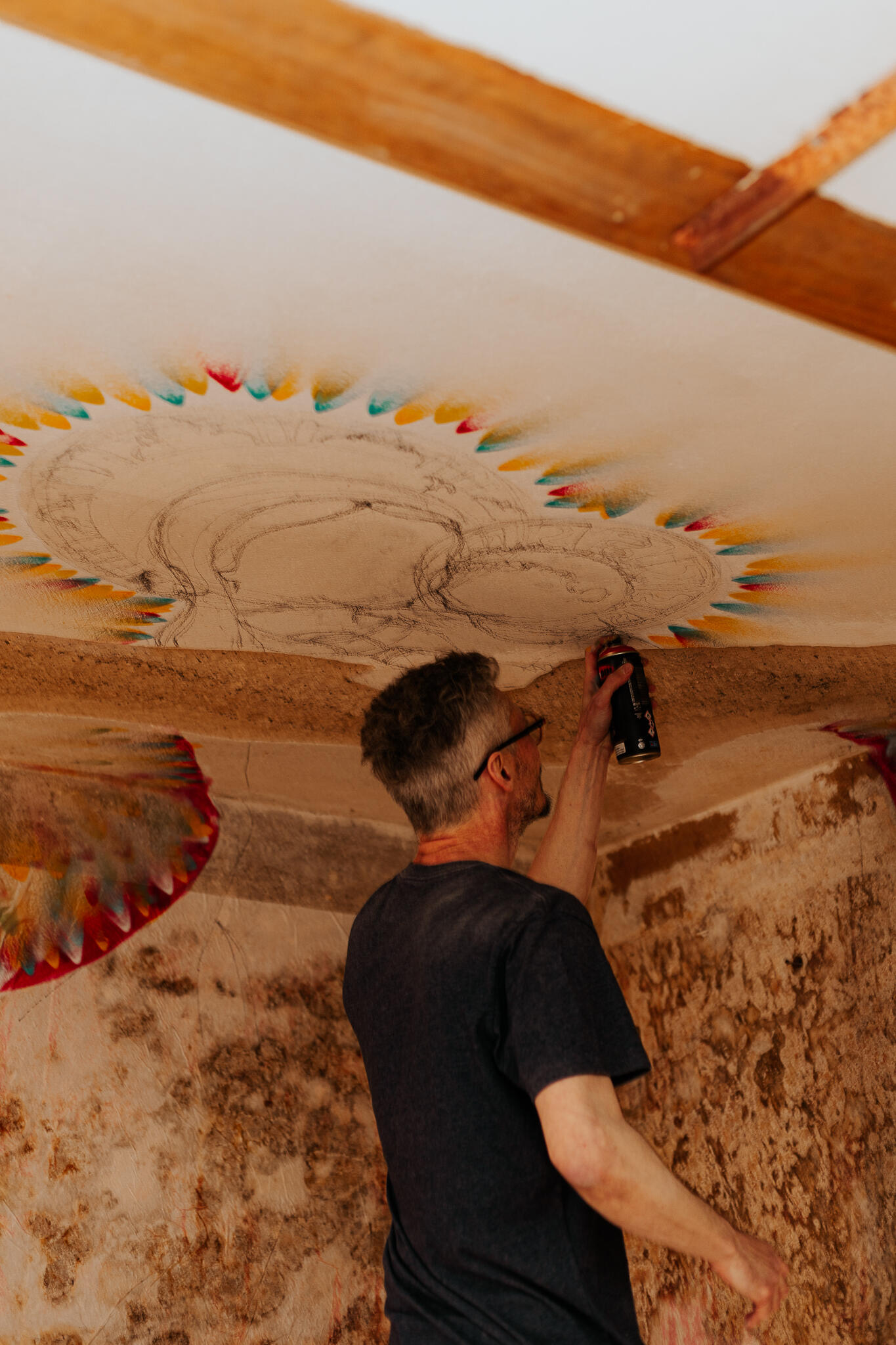 Obra original pintada na quina das paredes com o teto do porão da galeria de arte Lisa França. Pé direito do porão de aproximadamente 2,20m.