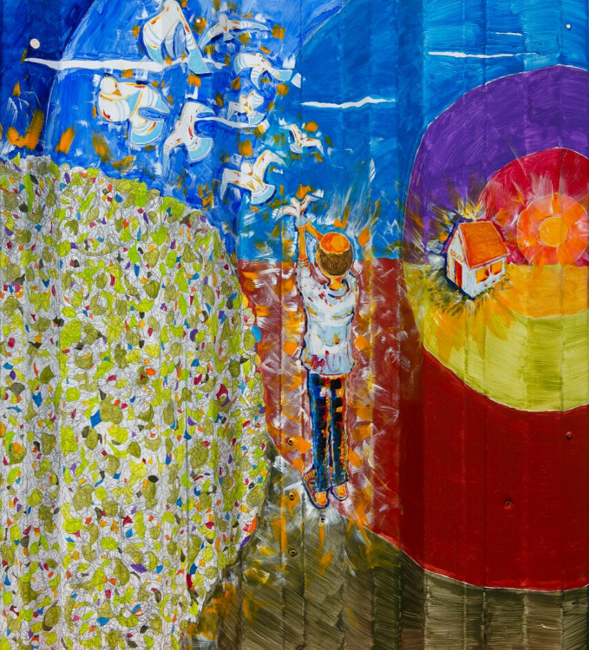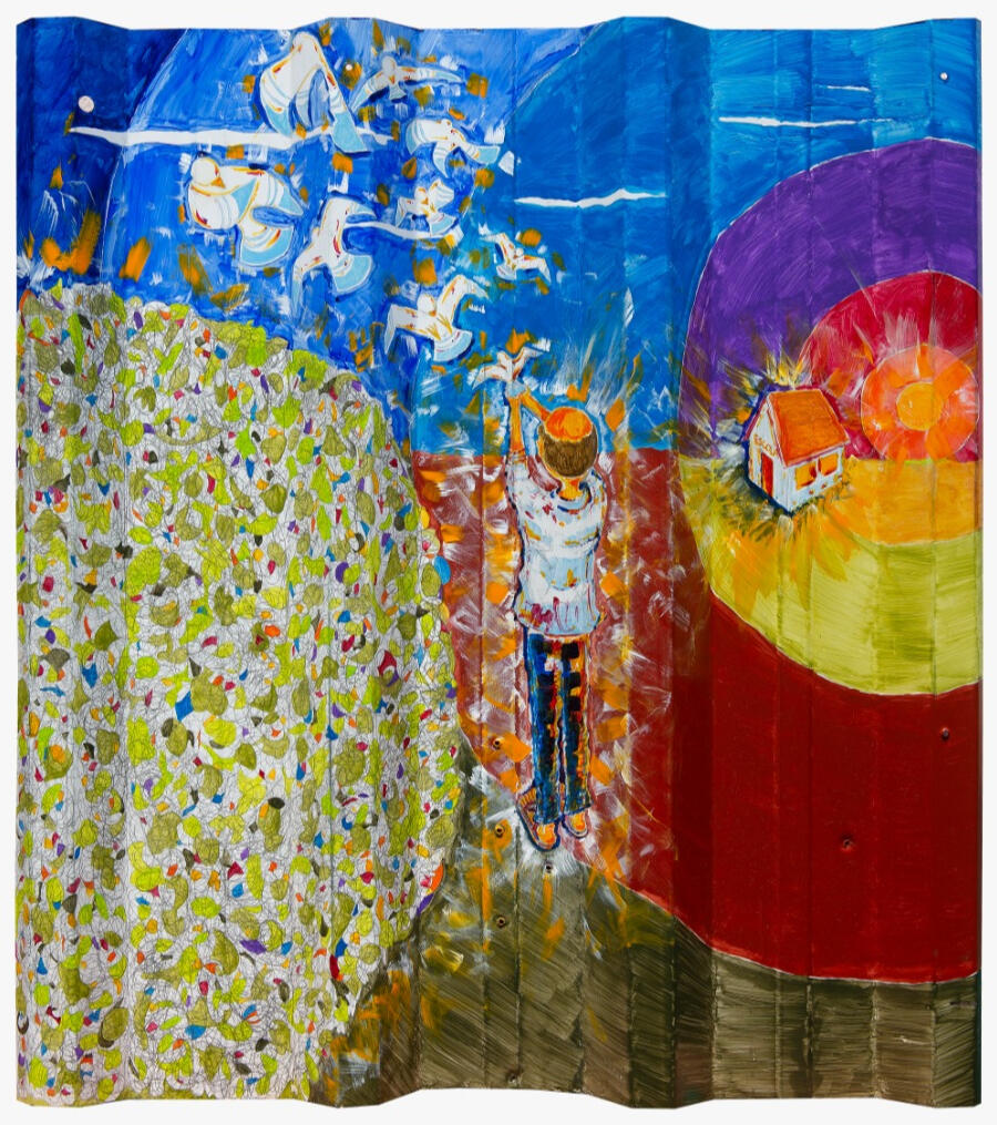 A tel(h)a é uma representação simbólica de personalidades históricas que dedicaram ou dedicam a produção da vida guiados pela liberdade. Assim, o resultado final é a consequência de um percurso de pesquisa e descobertas, do mergulho profundo no sentimento de liberdade conduzido por aqueles que decidiram fazer este percurso por completo: o camponês, uma homenagem a São Francisco de Assis; na revoada de pássaros recebendo o filhote, a sugestão estética dos saris das Missionárias da Caridade e da Santa Teresa de Calcutá; a Escola e a coragem de Malala Yousafzai; o Sol, iluminando a todos, é Gandhi; e por fim, repare no canto inferior esquerdo da tel(h)a e me responda….é a copa de uma árvore, ou a cabeça de Nelson Mandela, o Madiba, reconhecendo visualmente o Invictus e contemplando na cena o privilégio de ser livre?