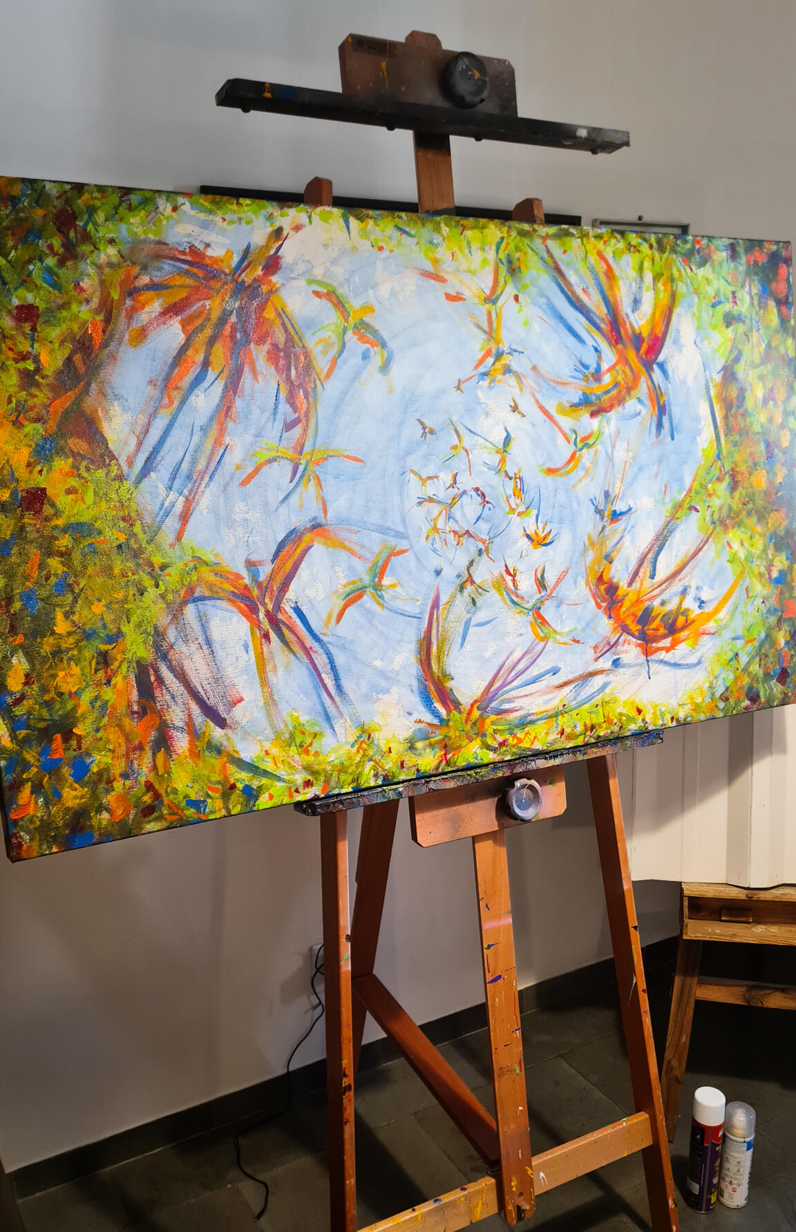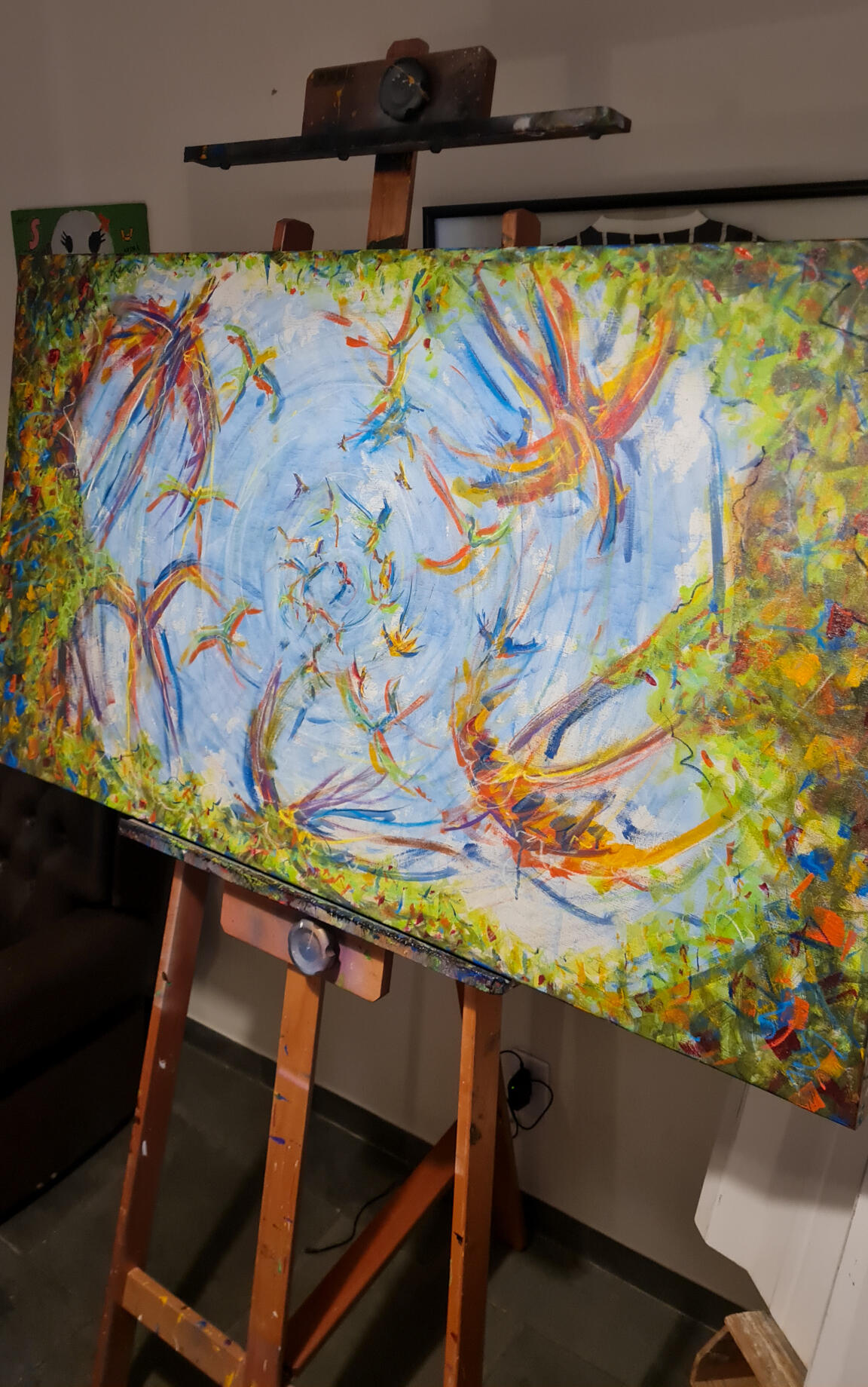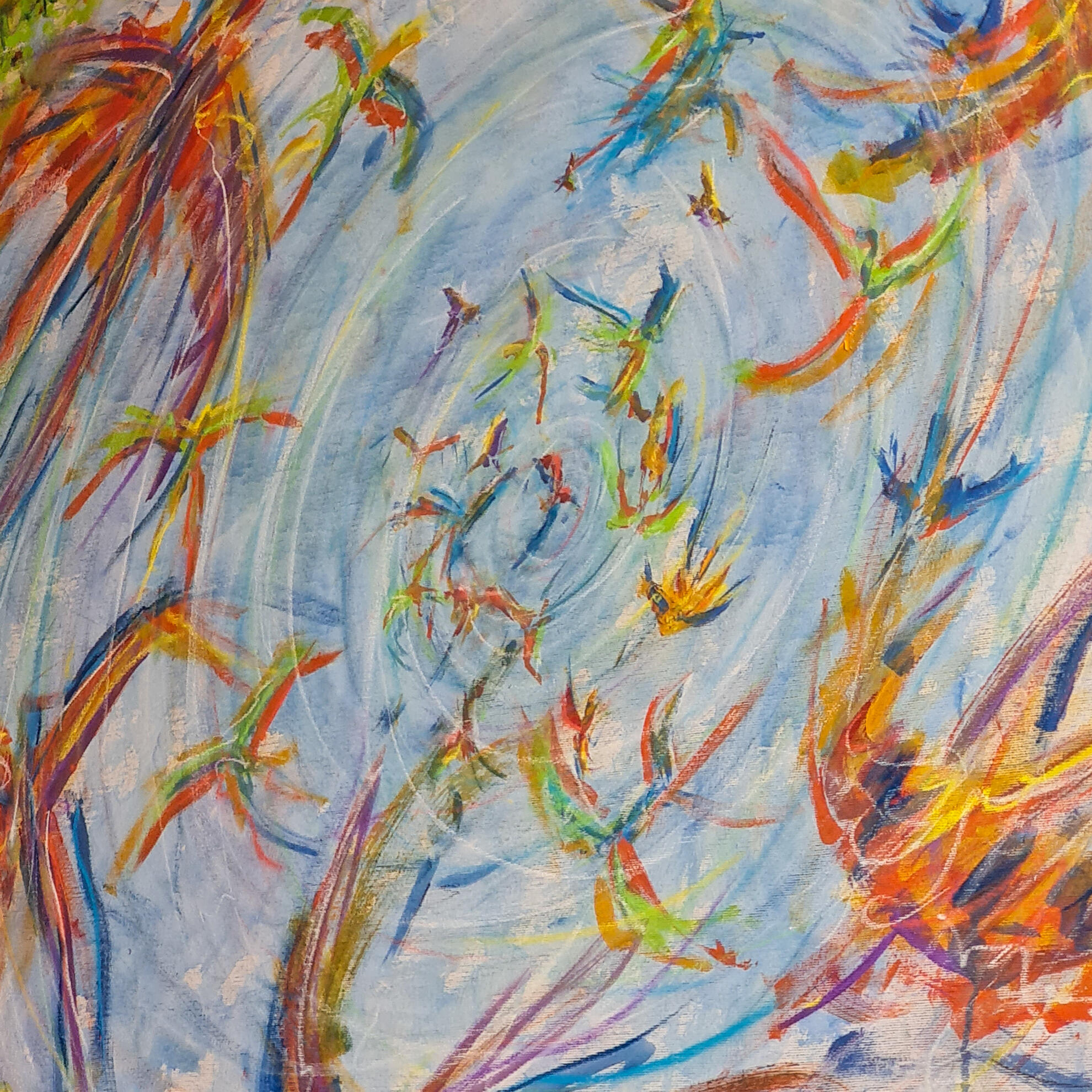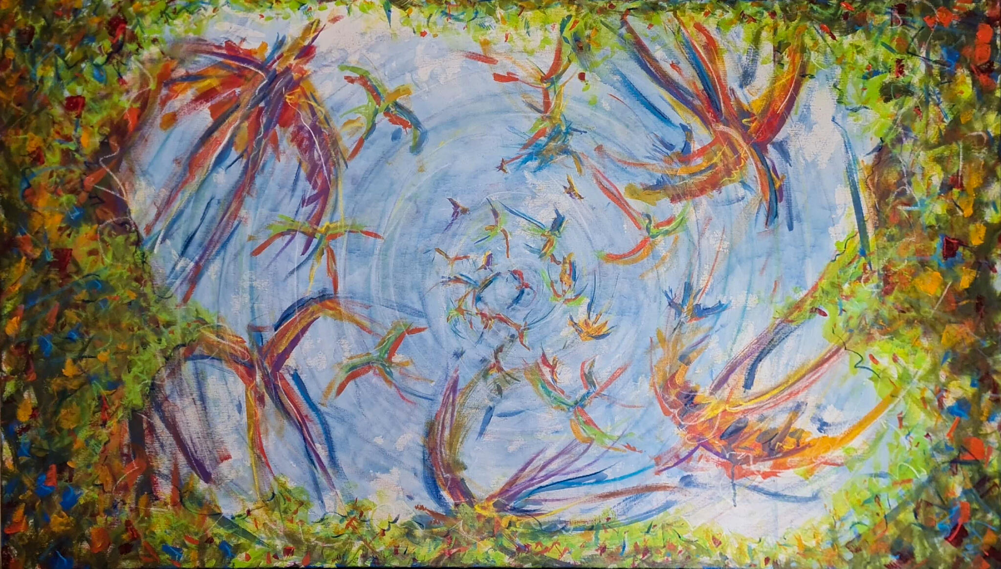 Passei o azul na mão e fui para a tela. Em movimentos que remetiam a forma do infinito, ocupei pouco a pouco a tela e, quando achei que já estava suficiente, dei dois passo para trás para ver o que tinha produzido. Estava lá...um céu com as nuvens. Imaginei então a cena de estar deitado em um gramado, olhando para um dia de céu aberto e por entre as árvores, um bando em revoada bailando em cores, formas e trazendo aos olhos um movimento contínuo de paz.