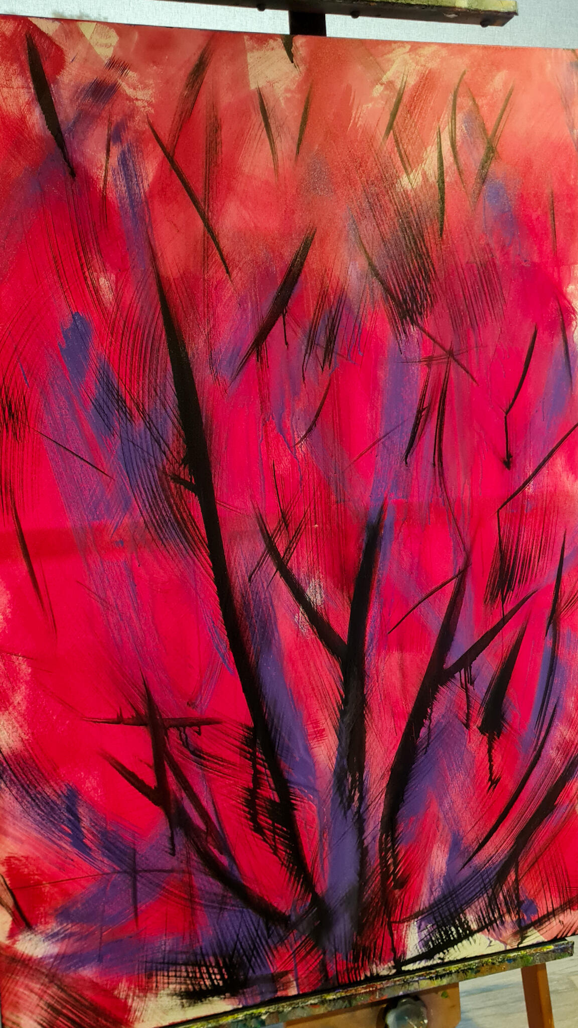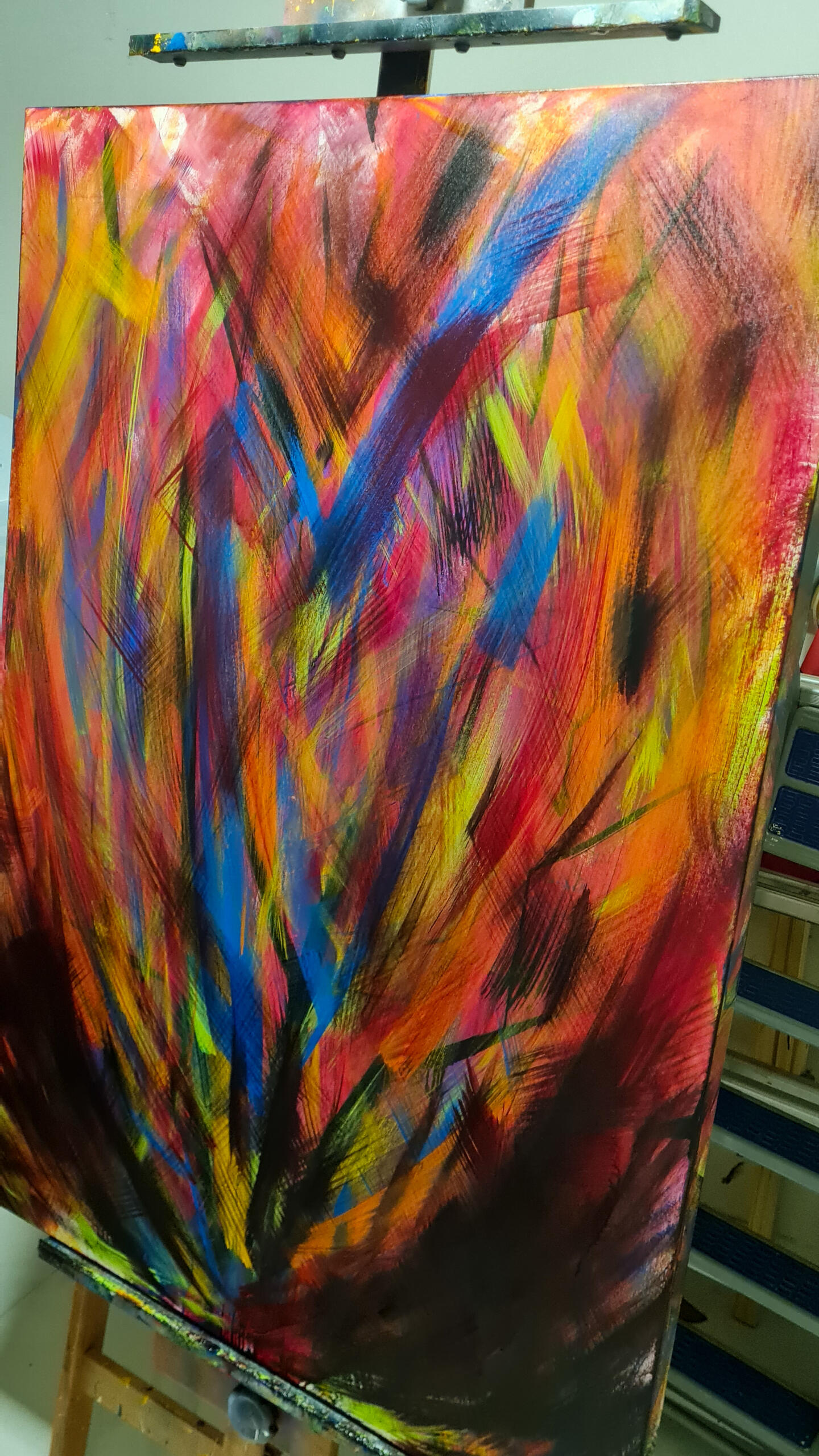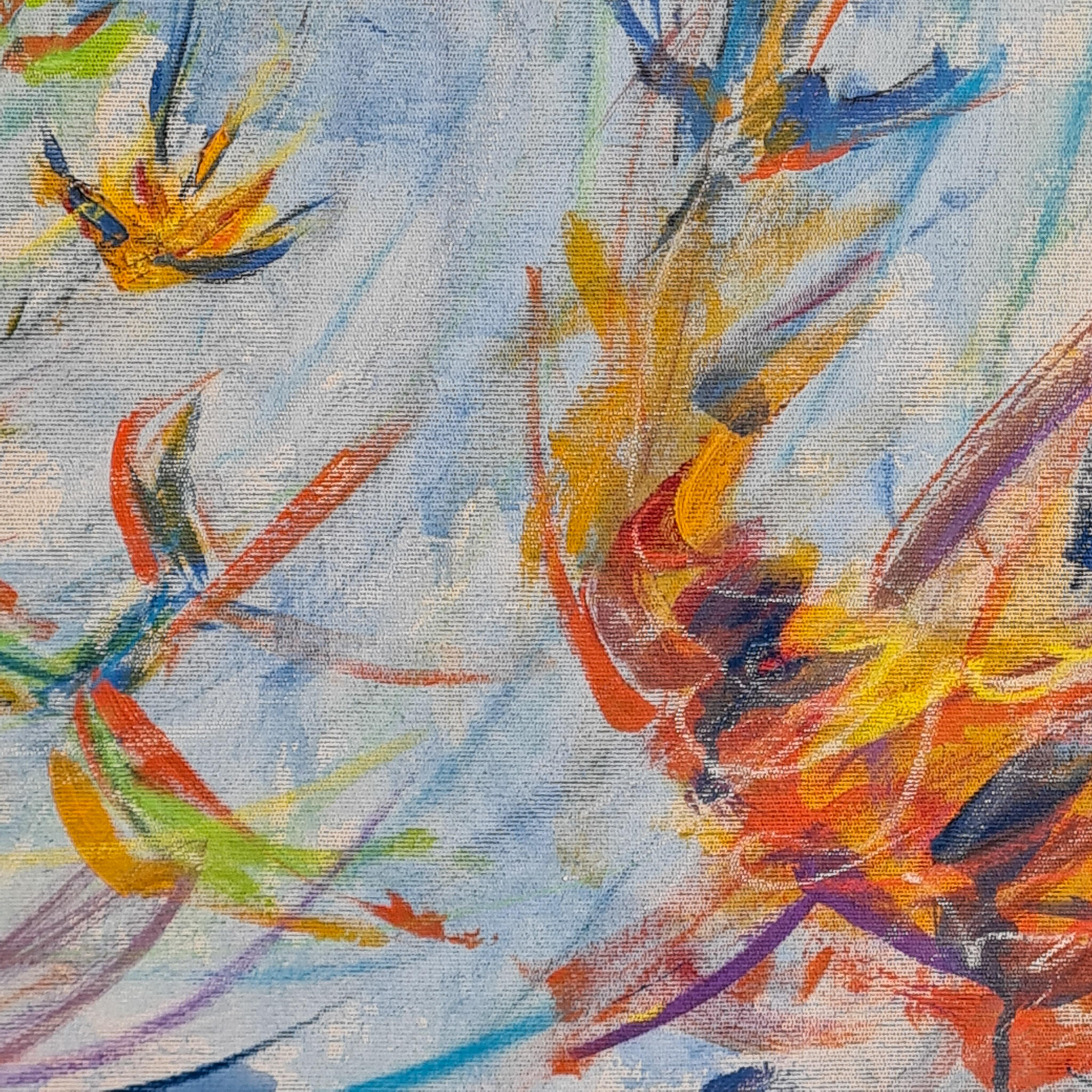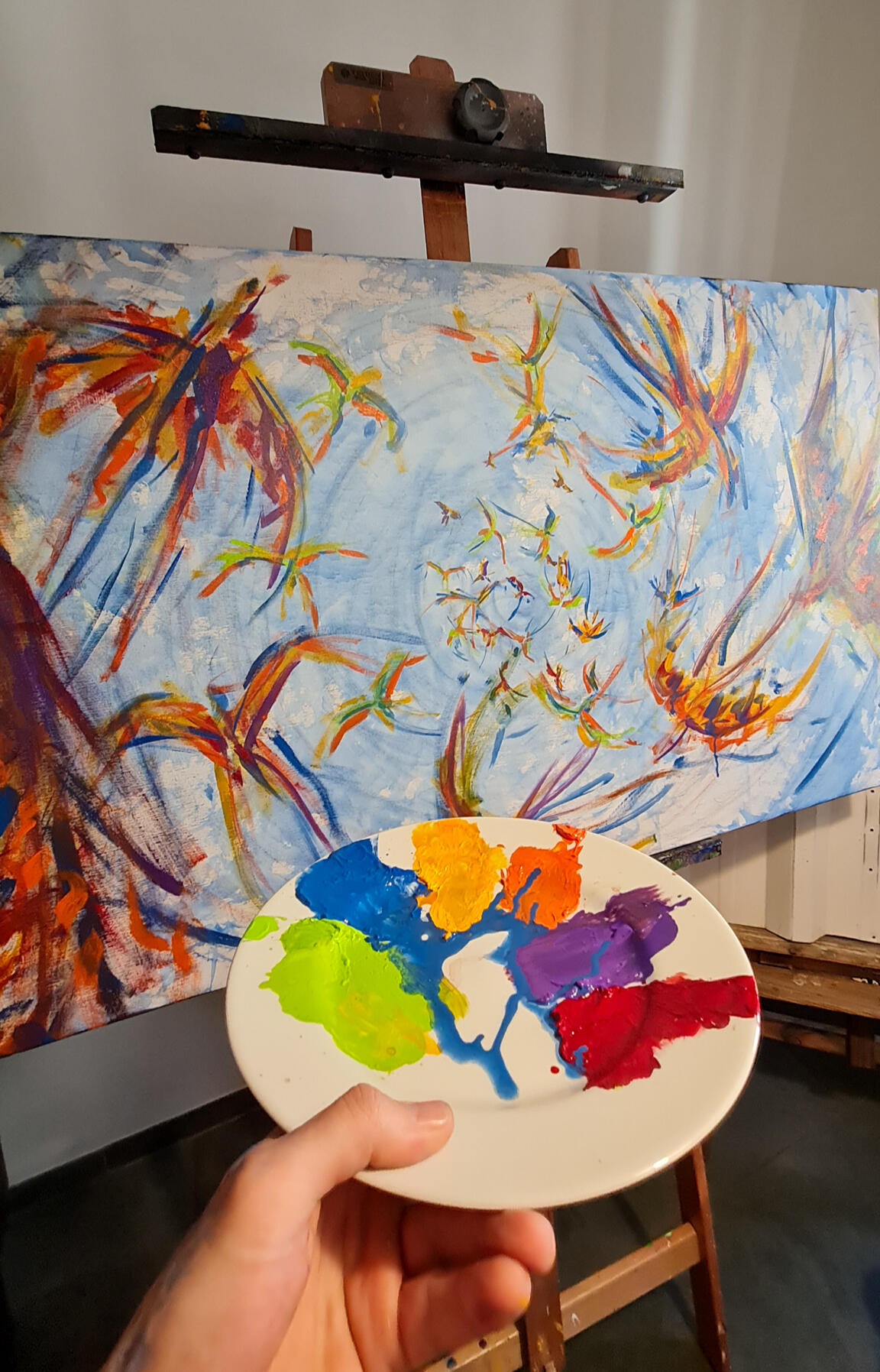Passei o azul na mão e fui para a tela. Em movimentos que remetiam a forma do infinito, ocupei pouco a pouco a tela e, quando achei que já estava suficiente, dei dois passo para trás para ver o que tinha produzido. Estava lá...um céu com as nuvens. Imaginei então a cena de estar deitado em um gramado, olhando para um dia de céu aberto e por entre as árvores, um bando em revoada bailando em cores, formas e trazendo aos olhos um movimento contínuo de paz.