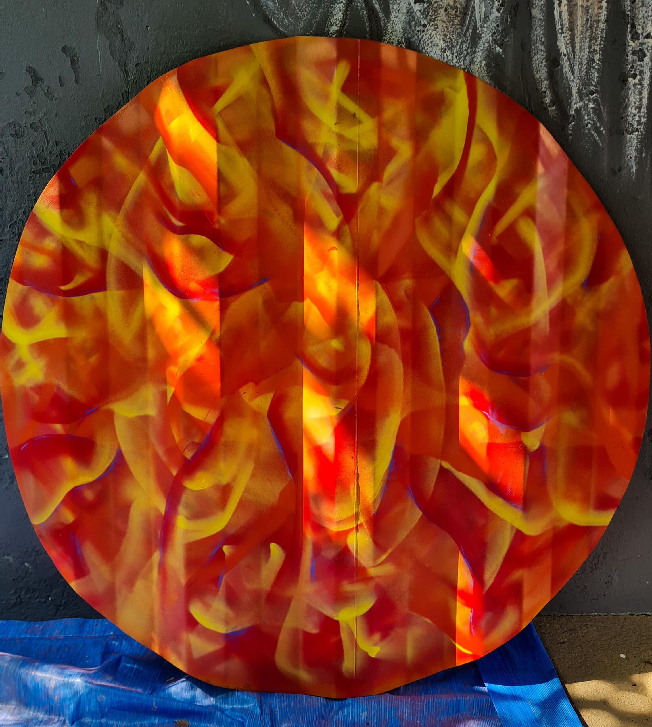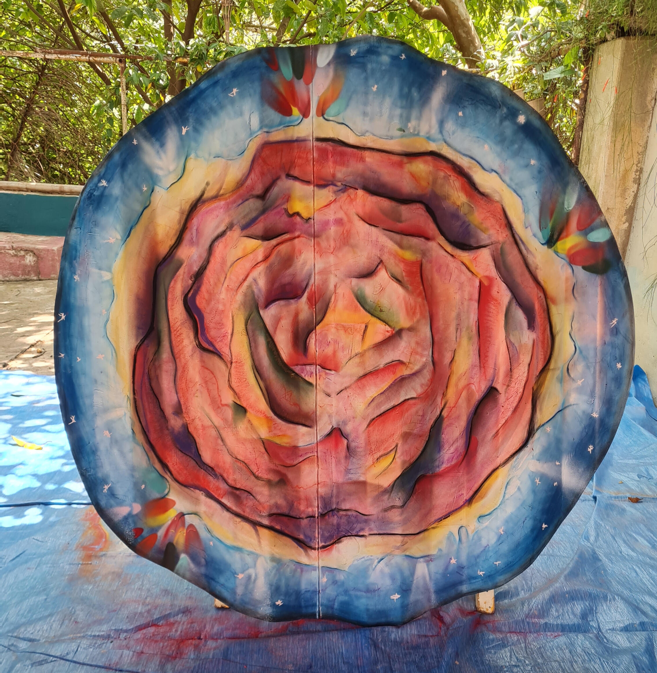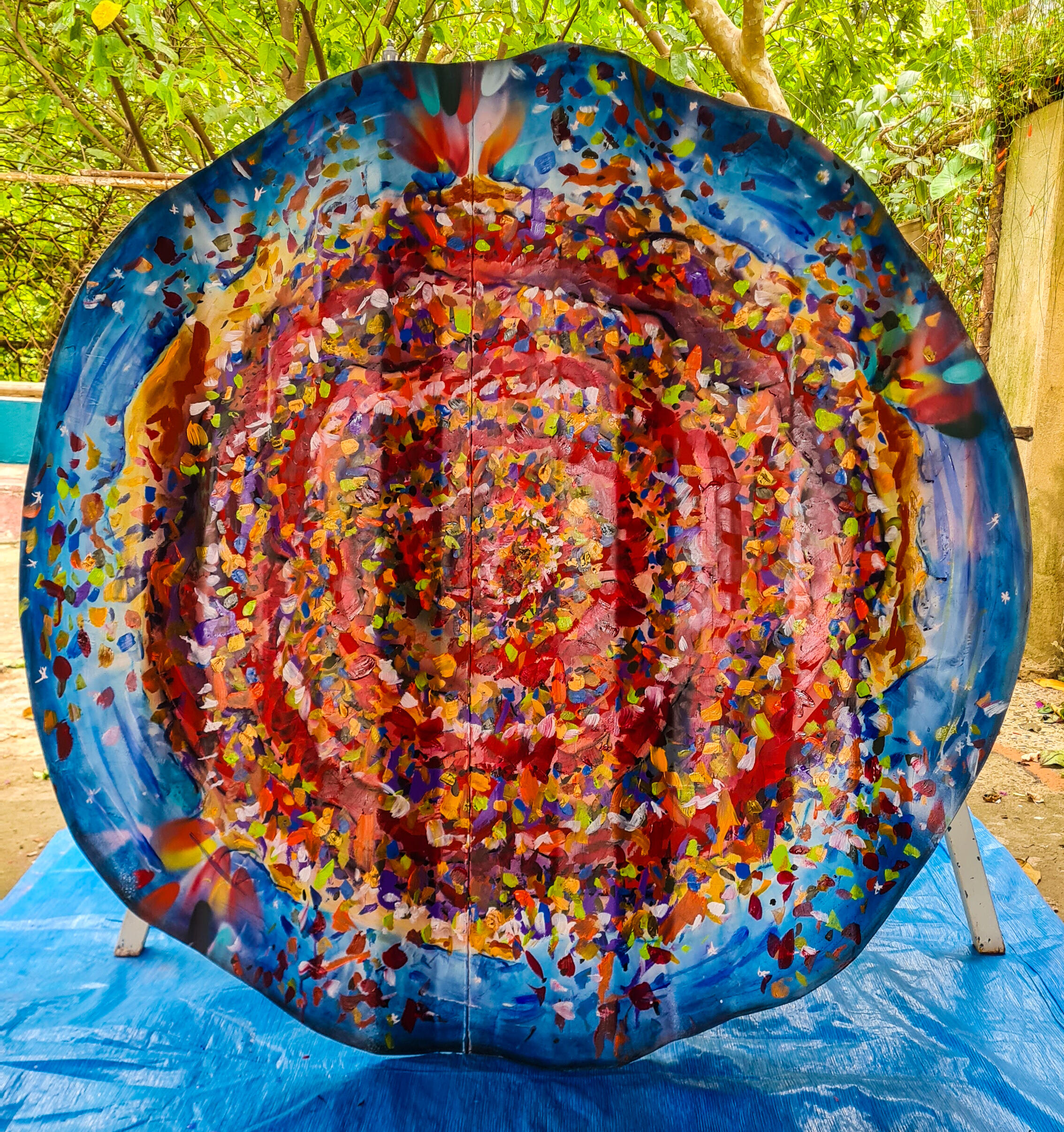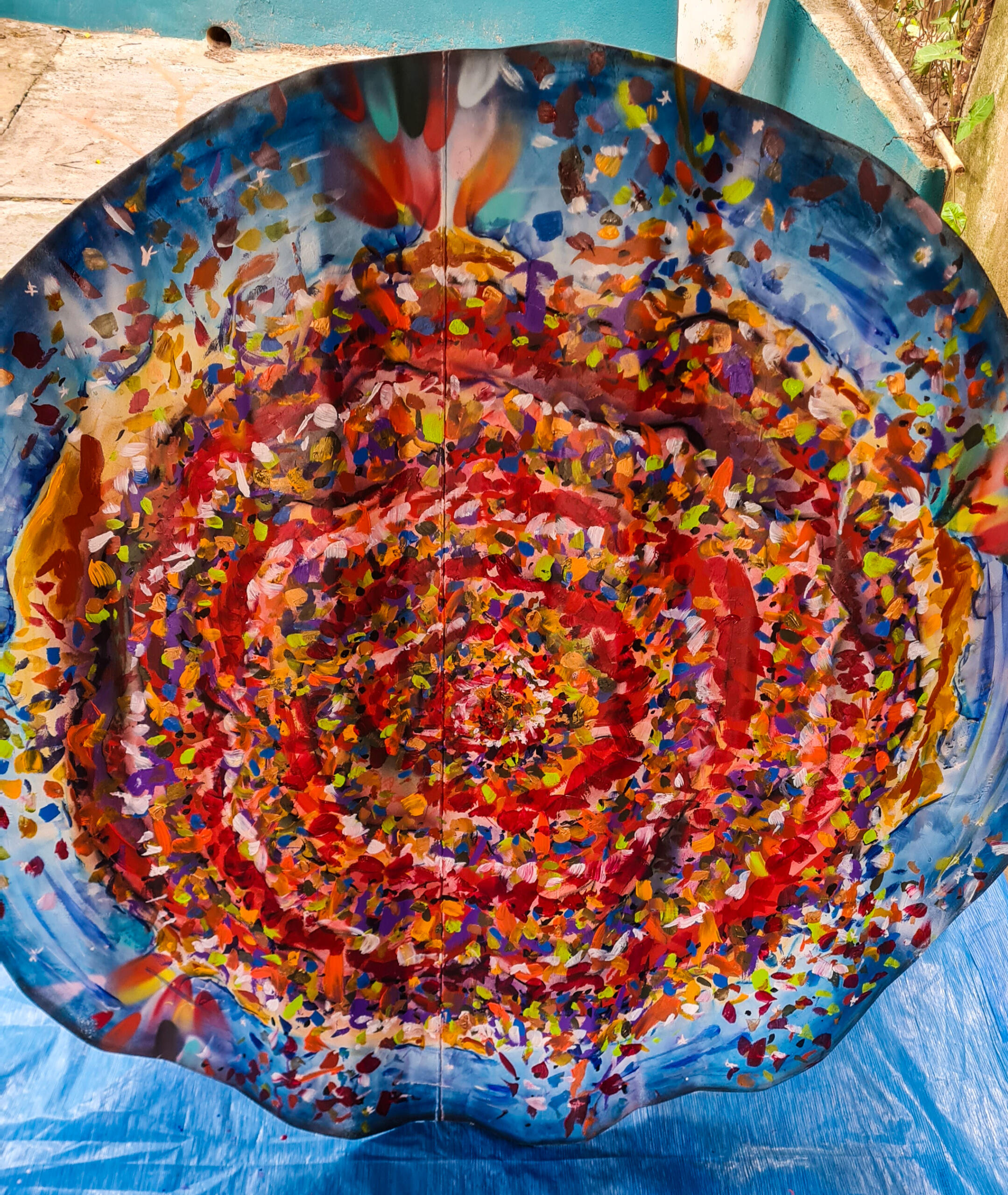 Chapa de container cortada com ≈1,20m de diâmetro. Técnica mista de grafite, giz pastel e tinta acrílica.
