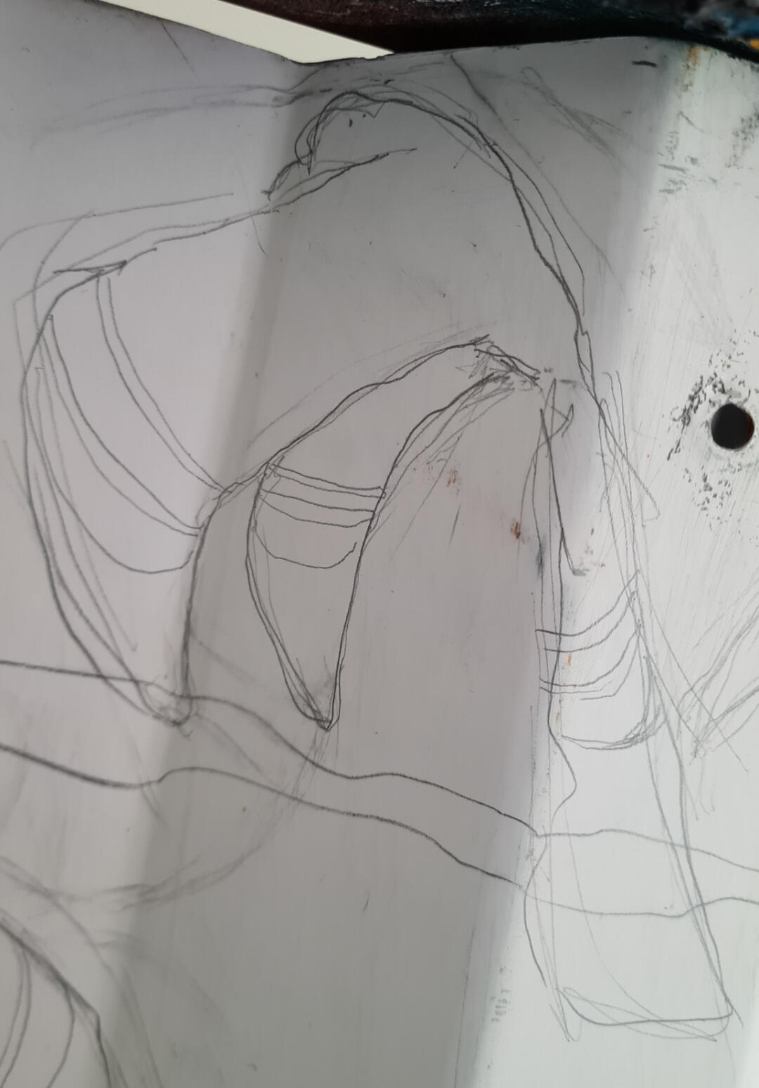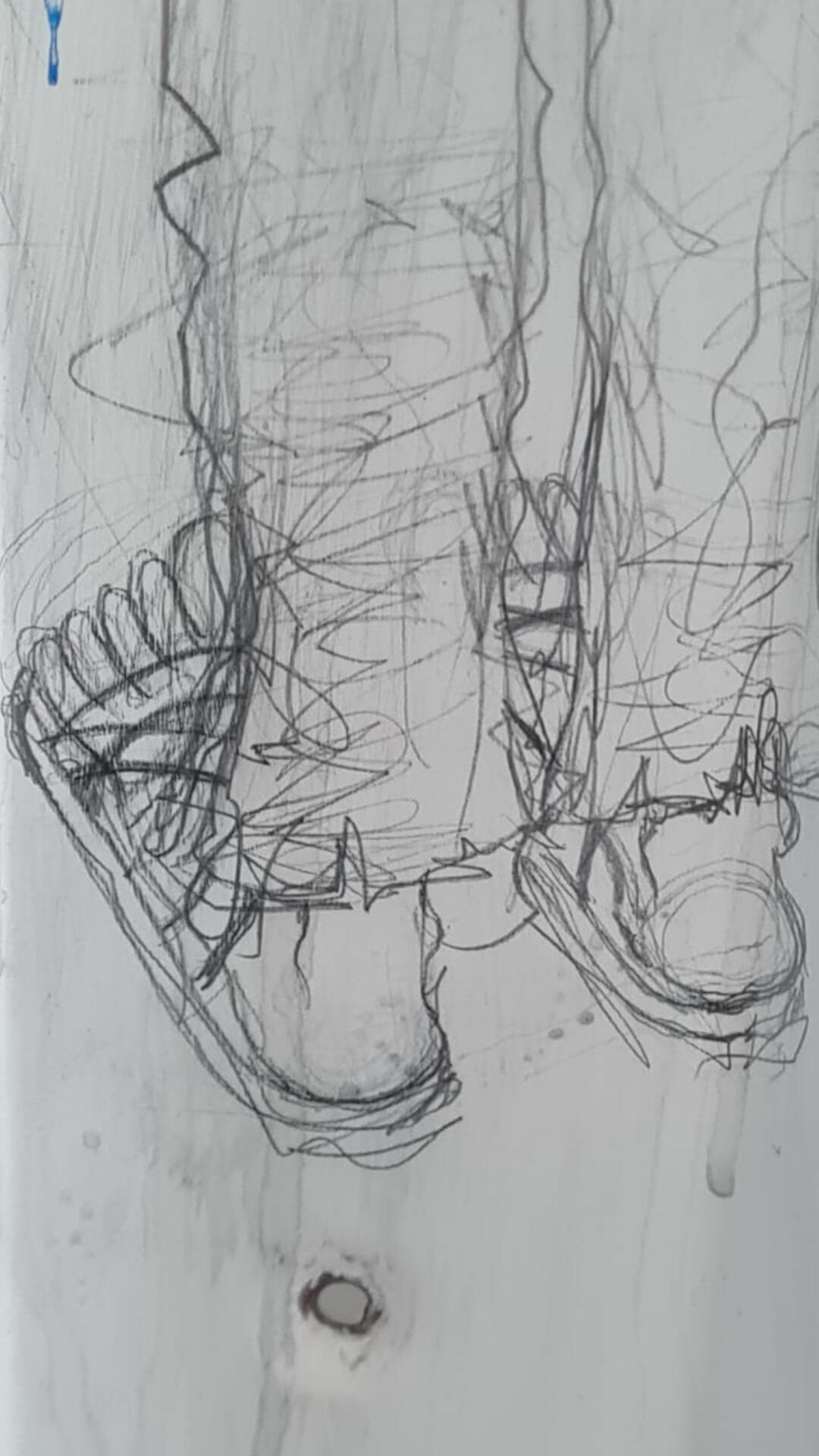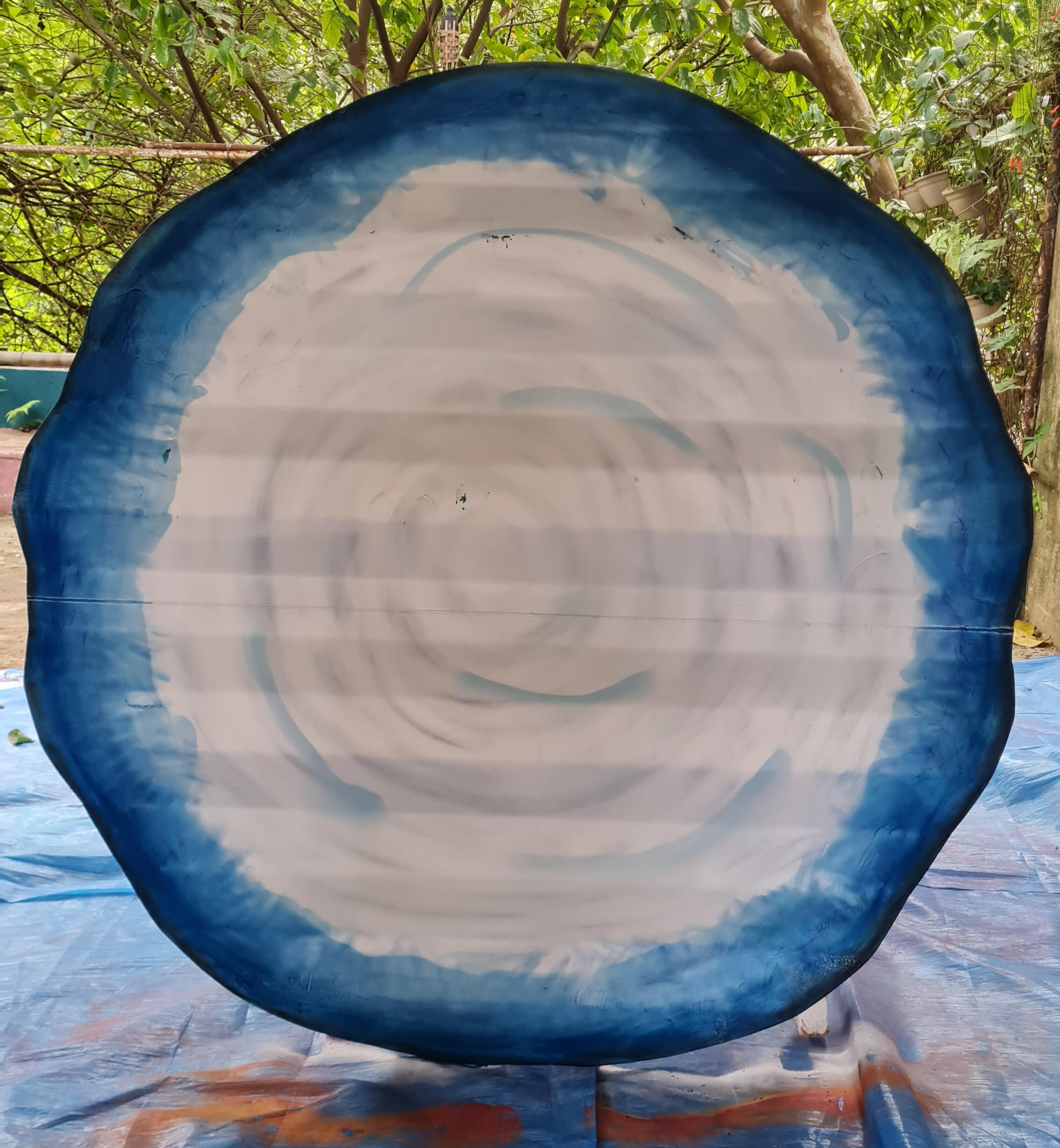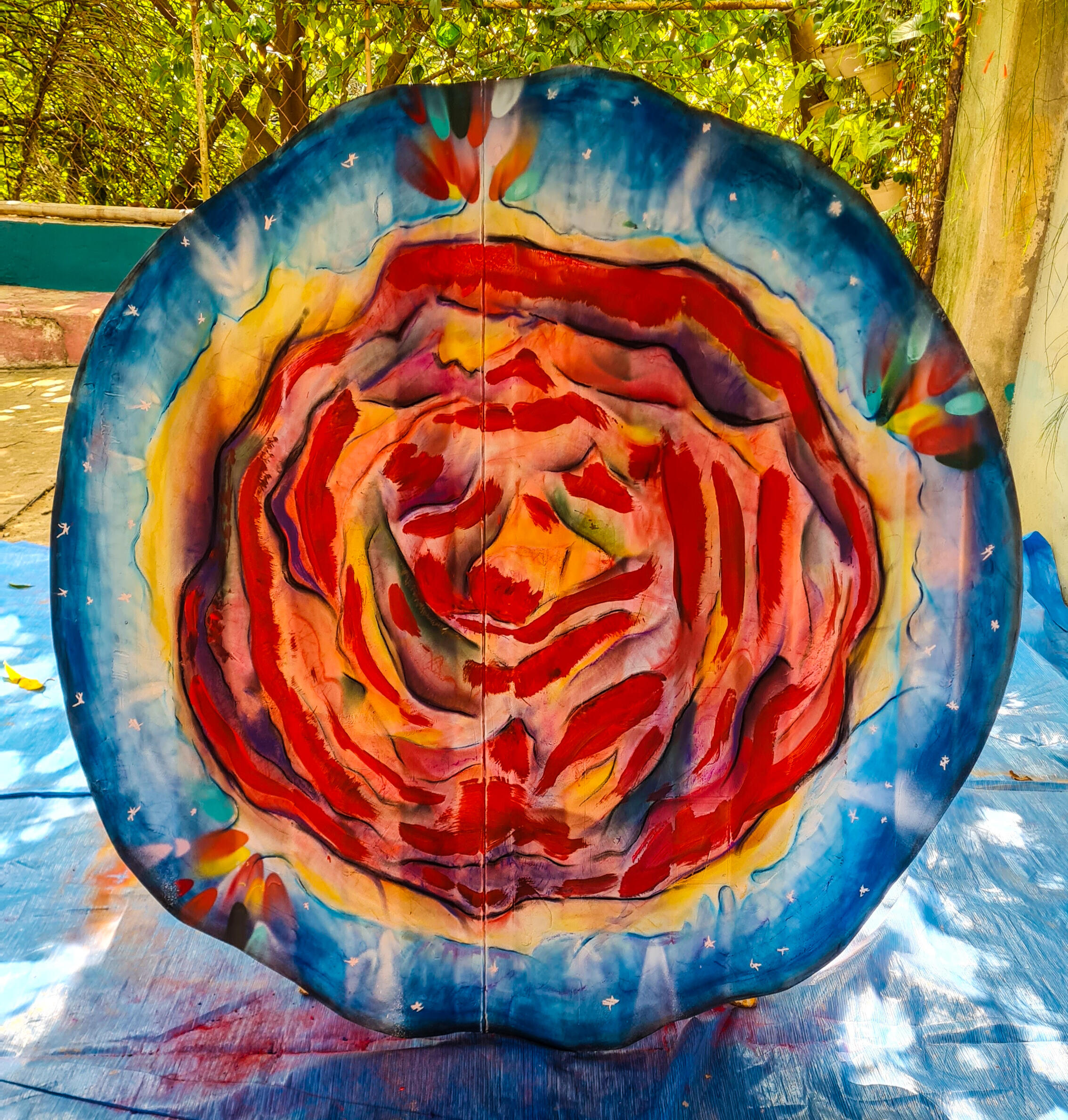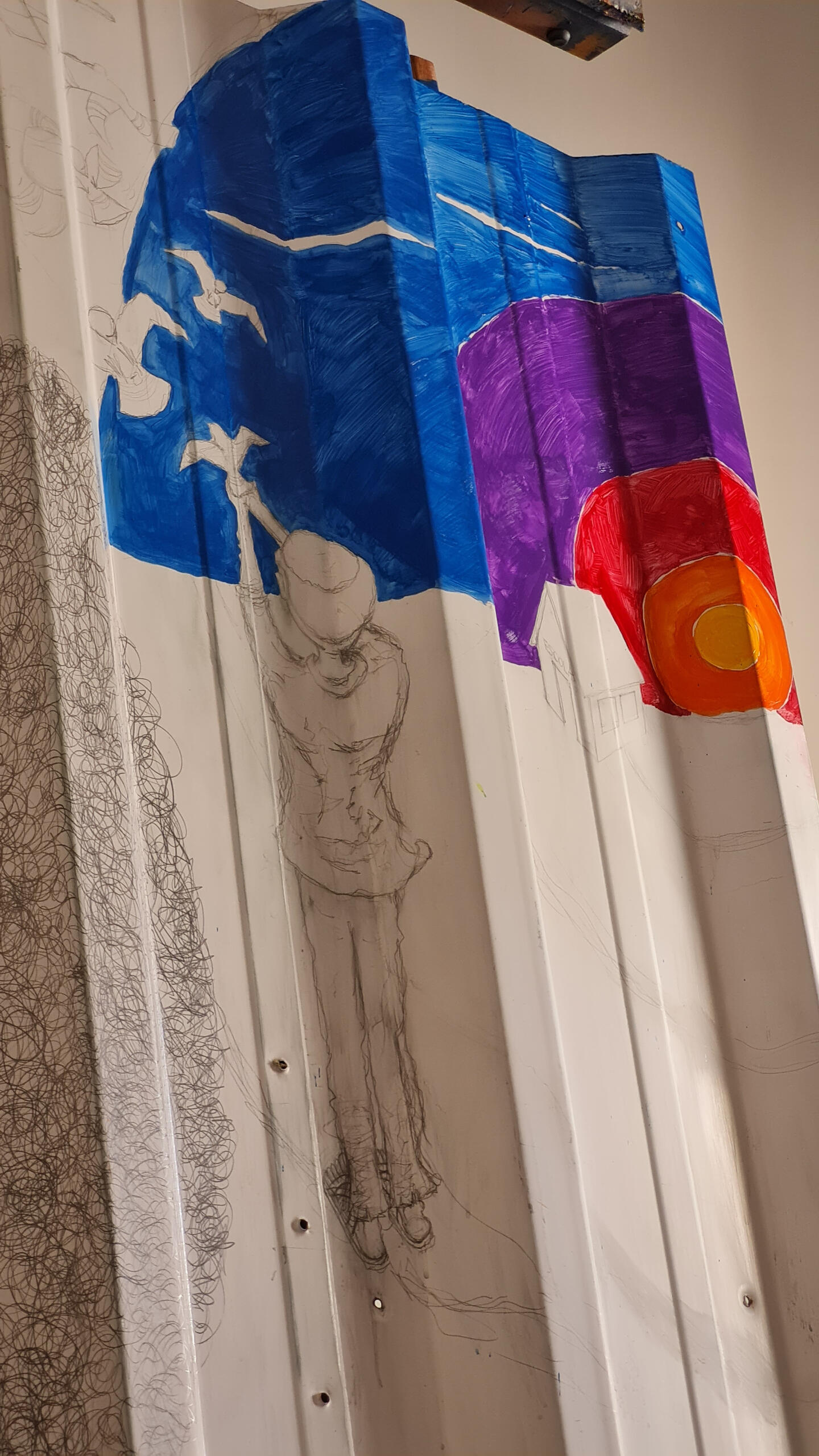 Chapa de container cortada com ≈1,20m de diâmetro. Técnica mista de grafite, giz pastel e tinta acrílica.